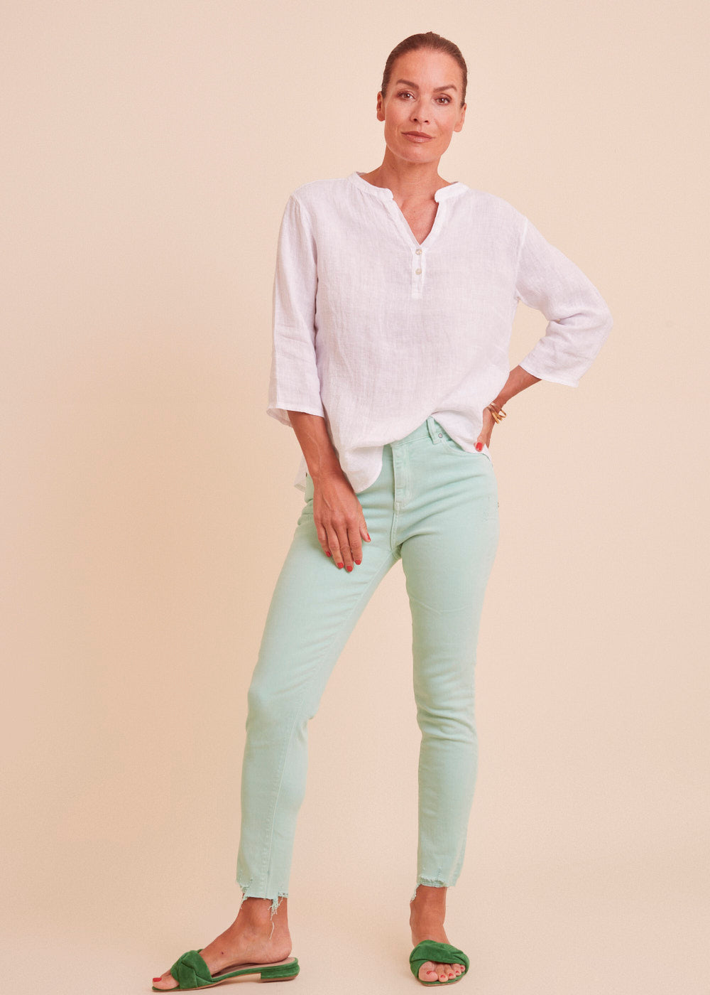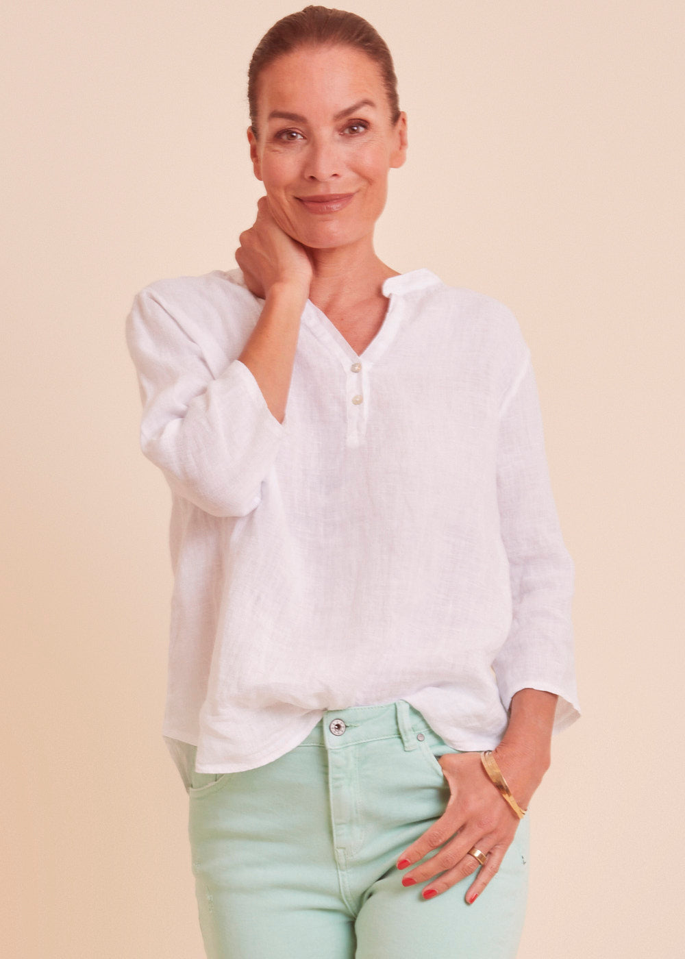 Leinen ist das perfekte Material für die heißen Sommertage. Diese lässig sitzende weiße Leinenbluse mit einem besonders schönen Ausschnitt und angedeuteter Knopfleiste ist ein absoluter Alleskönner. Das luftig leichte Material schmiegt sich angenehm an deinem Körper an.