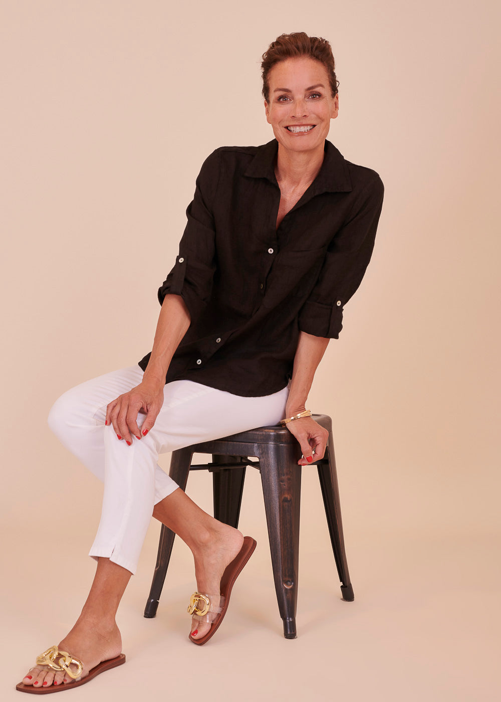 Leinenbluse mit Hemdkragen und Knopfleiste, Langarm mit Krempelriegel für 3/4-Länge. Die Hemdbluse ist sowohl bei schicken Anlässen als auch im Büro eine gute Option. Durch die praktische Knopfleiste sitzt deine Frisur auch noch nach dem An- oder Umziehen. Diese Bluse ist hüftlang sowie lässig geschnitten, sodass du dich wohlfühlst. Ein Traum in Schwarz.
