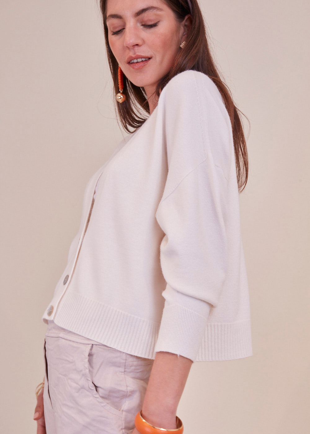 Kurz und kastenförmig geschnittene Strickjacke mit langen Armen aus unserem Bestseller Garn. Sie hat ein Rippenbündchen an den Ärmeln und am Saum. Durch die Frontknöpfe lässt sich diese Jacke wunderbar geschlossen tragen. Zum darunter tragen empfehlen wir dir unsere Basic Tops. Kuschelig weicher Tragekomfort mit absoluter Wohlfühlgarantie.