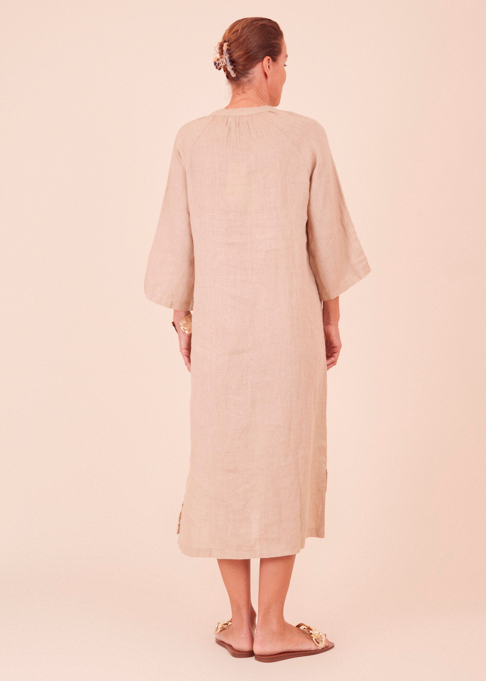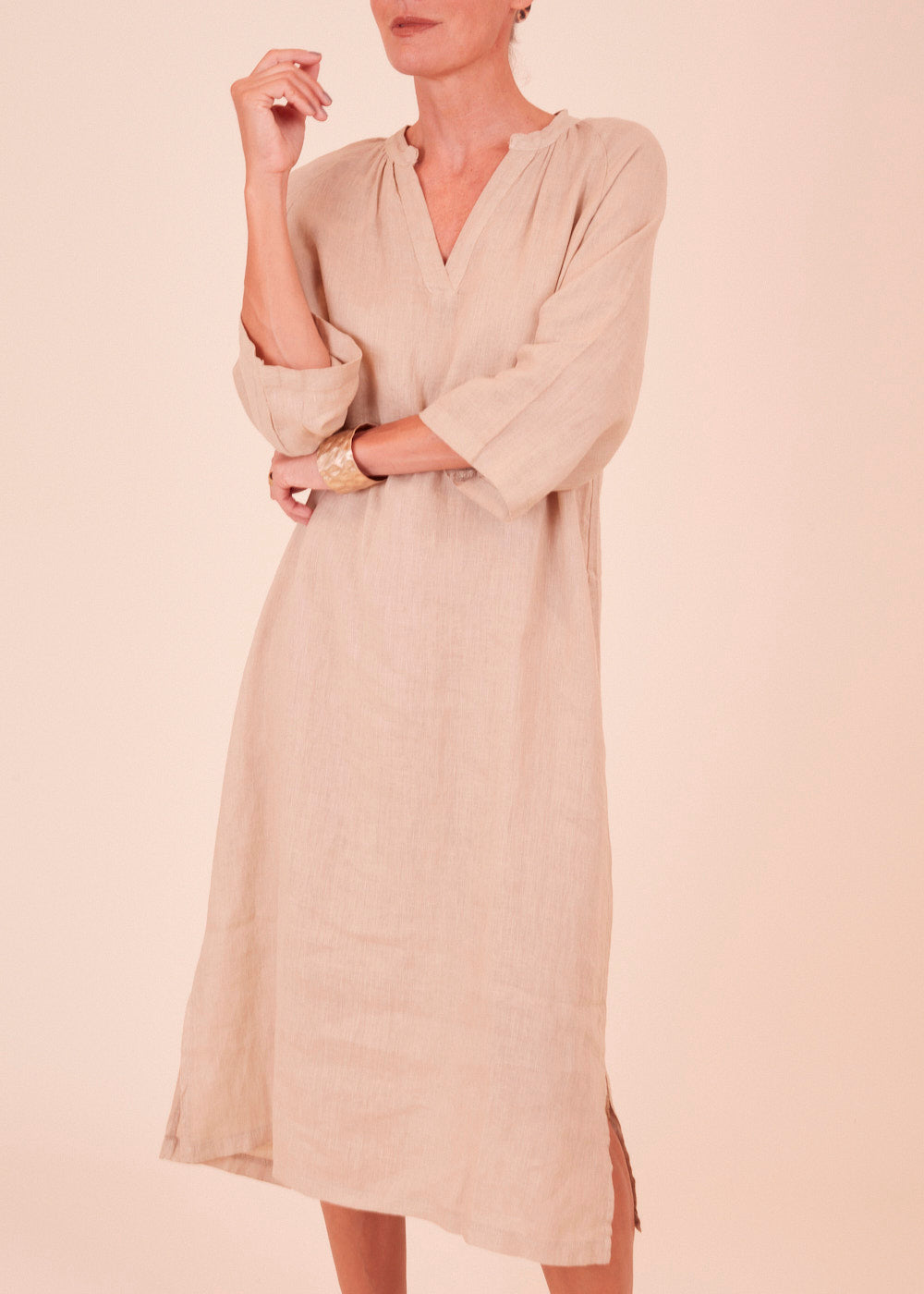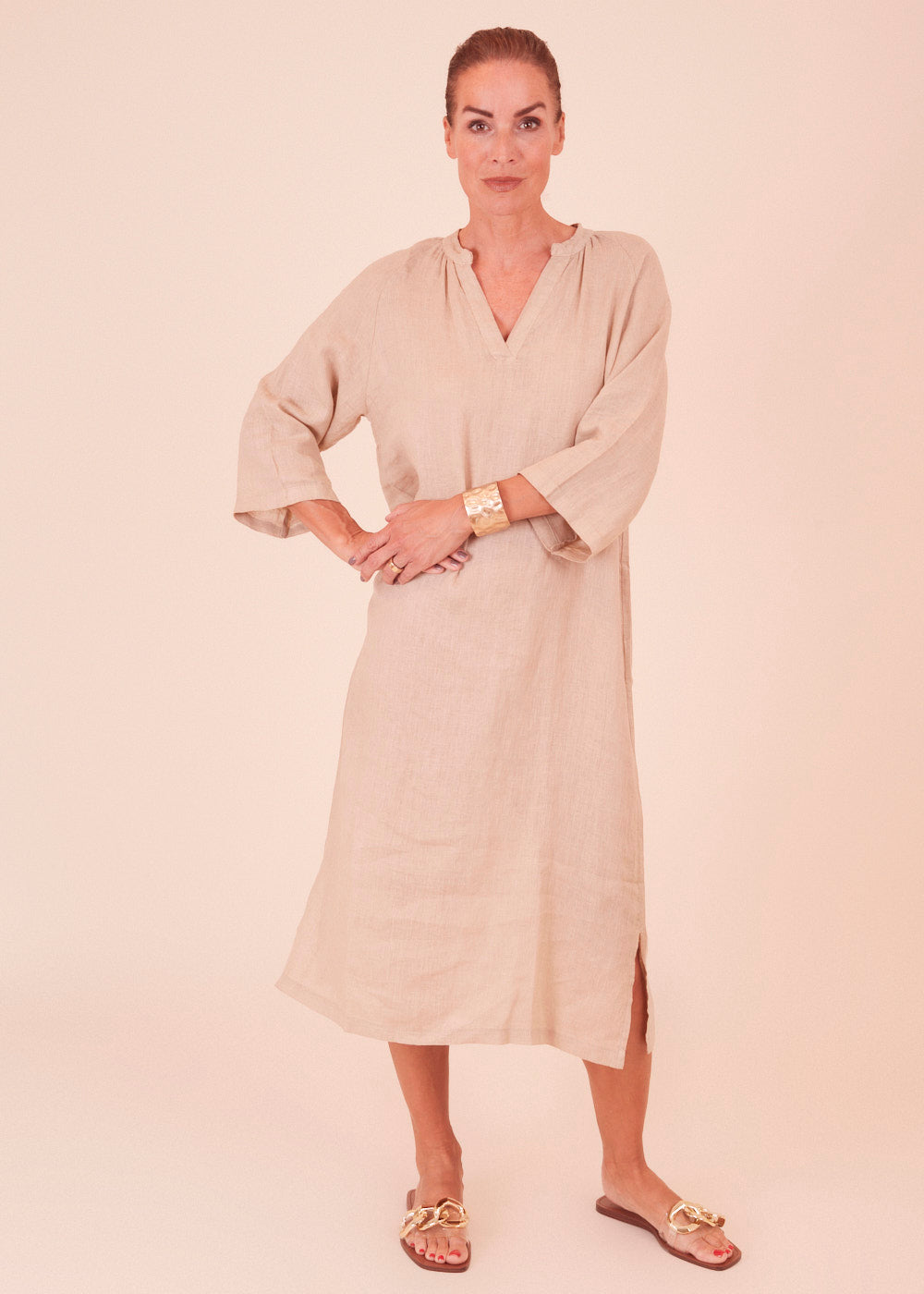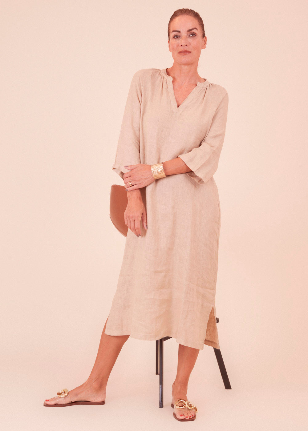 Bist du auf der Suche nach einem neuen Kleid? Mit diesem Kleid bist du lässig angezogen. Der weite Schnitt umspielt deine Figur. Der Stehkragen gibt dem Outfit den perfekten Touch. Das kühlende Leinenmaterial ist auch bei extremer Hitze angenehm auf deiner Haut!