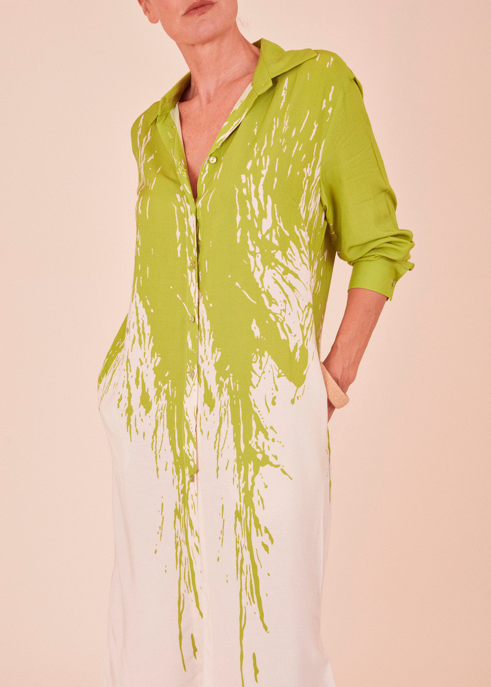 Dieses sommerliche Kleid erstrahlt in frischen neuen Trendfarben und einem All-Over-Print. Das Kleid besitzt einen Hemdkragen, sowie langen Ärmel. Der fließende Schnitt sorgt für ein luftig-leichtes Tragegefühl. Mit seitlichen Eingriffstaschen, einfach besonders!