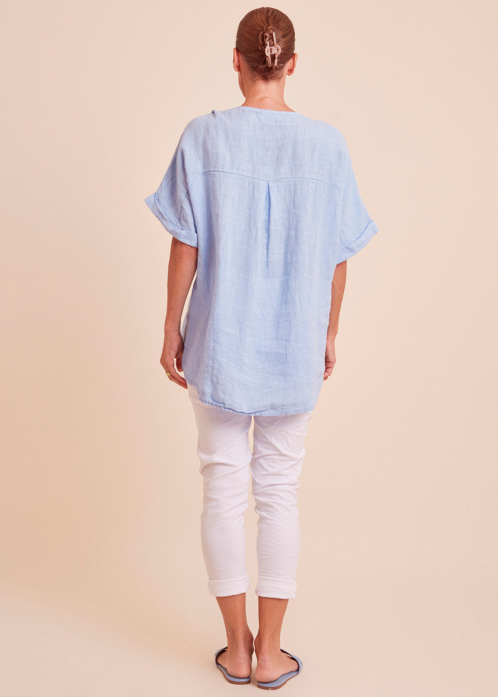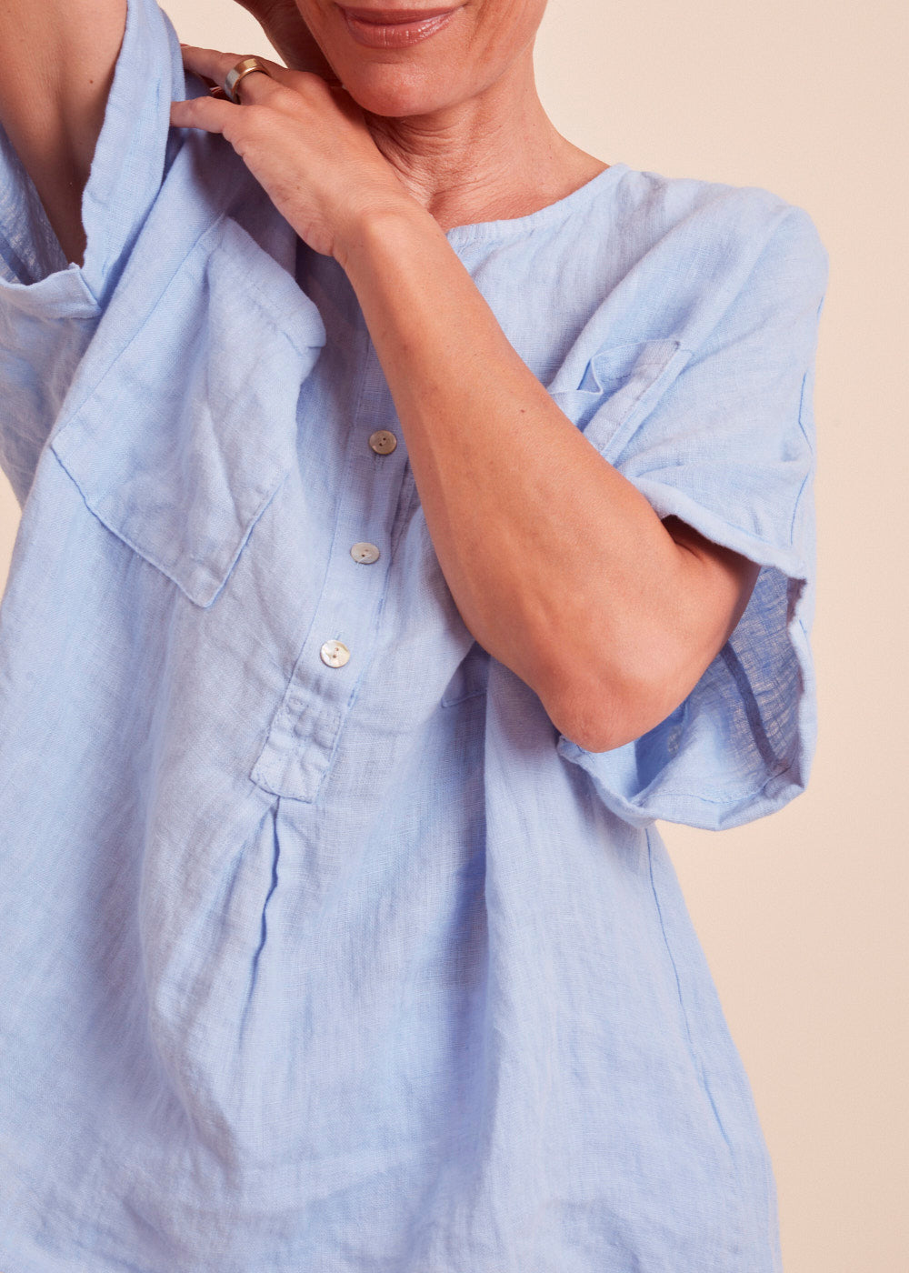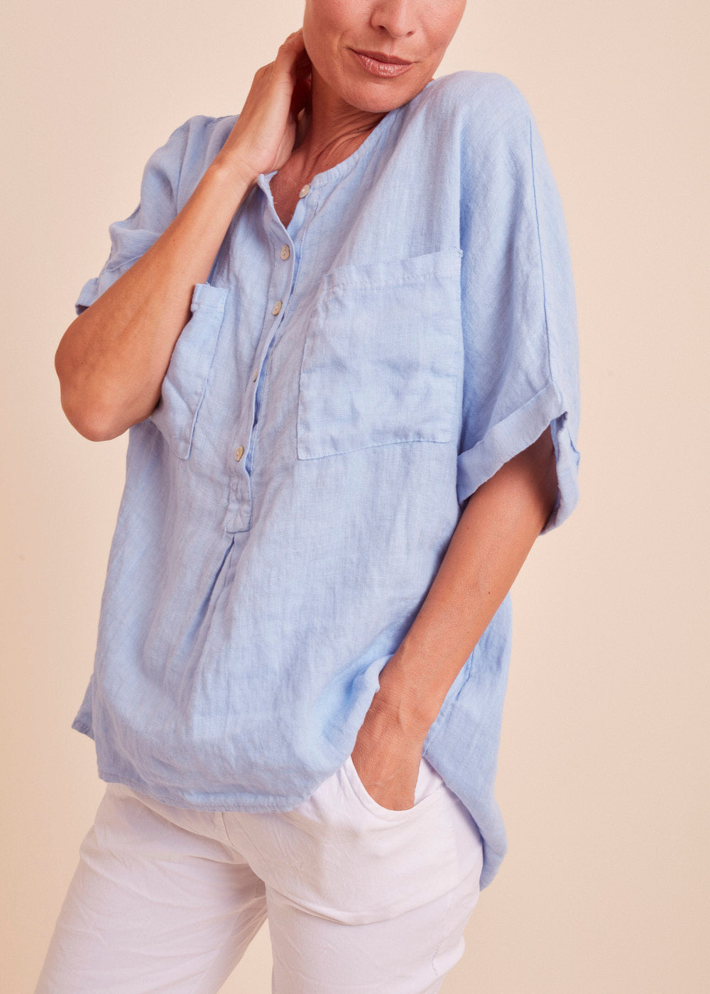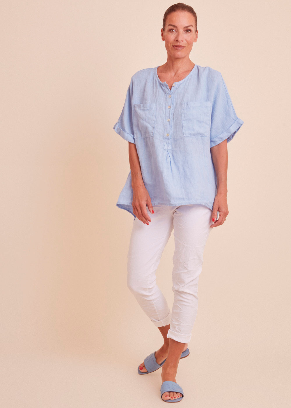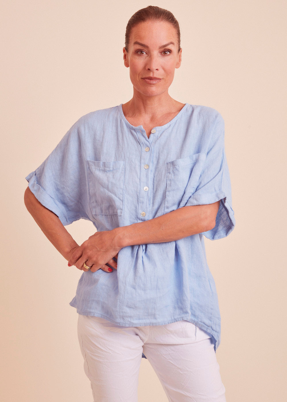 Mit diesem kurzarm Leinenhemd zieht ein luftiges Oberteil bei dir im Kleiderschrank ein, das an lauen Sommerabenden dein Outfit verschönert. Durch seine kühlende Leinenqualität fällt diese Bluse schön fließend und gibt dir ein wunderbares Tragegefühl. Mit einer halben Knopfleiste und zwei Brusttaschen.