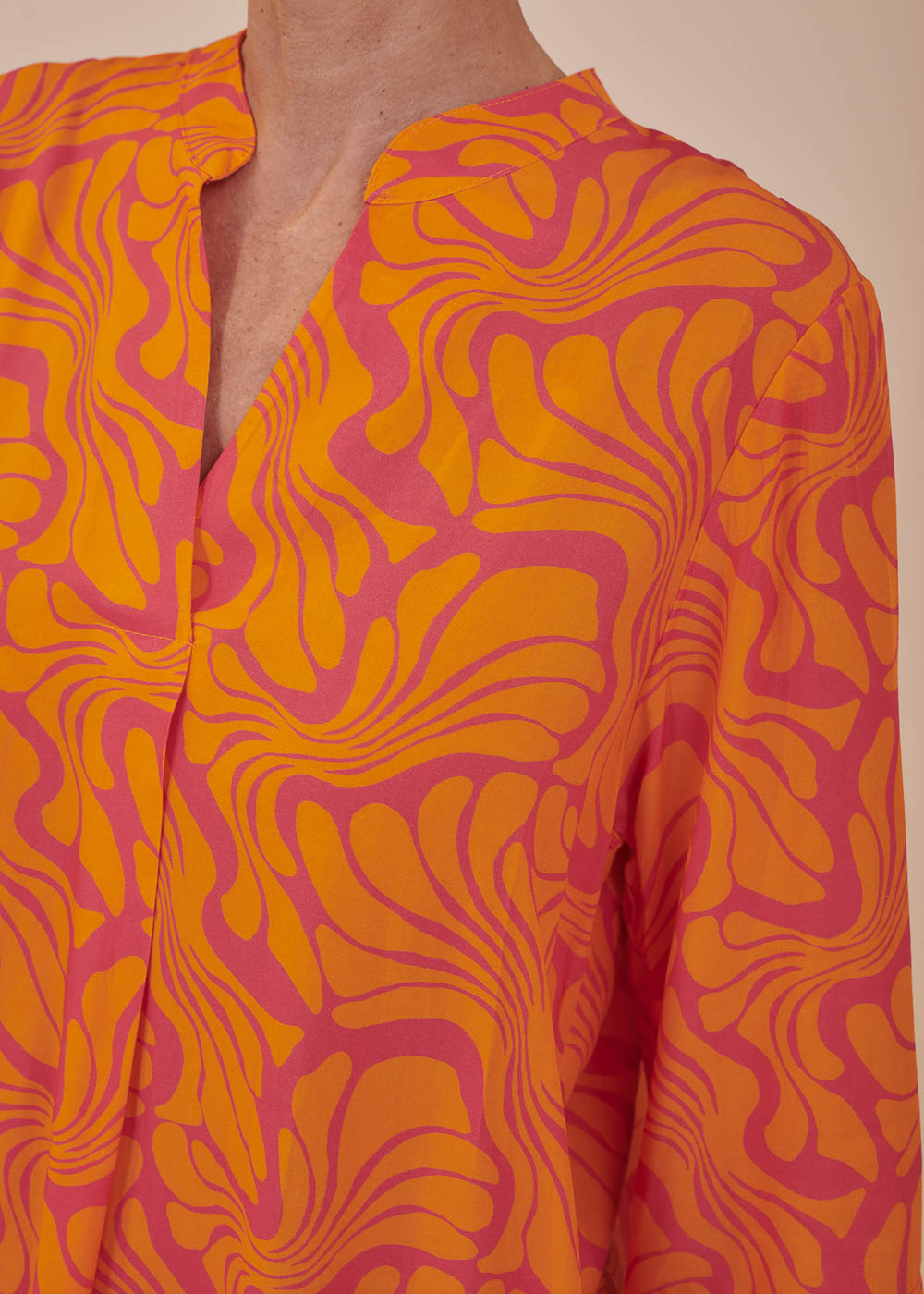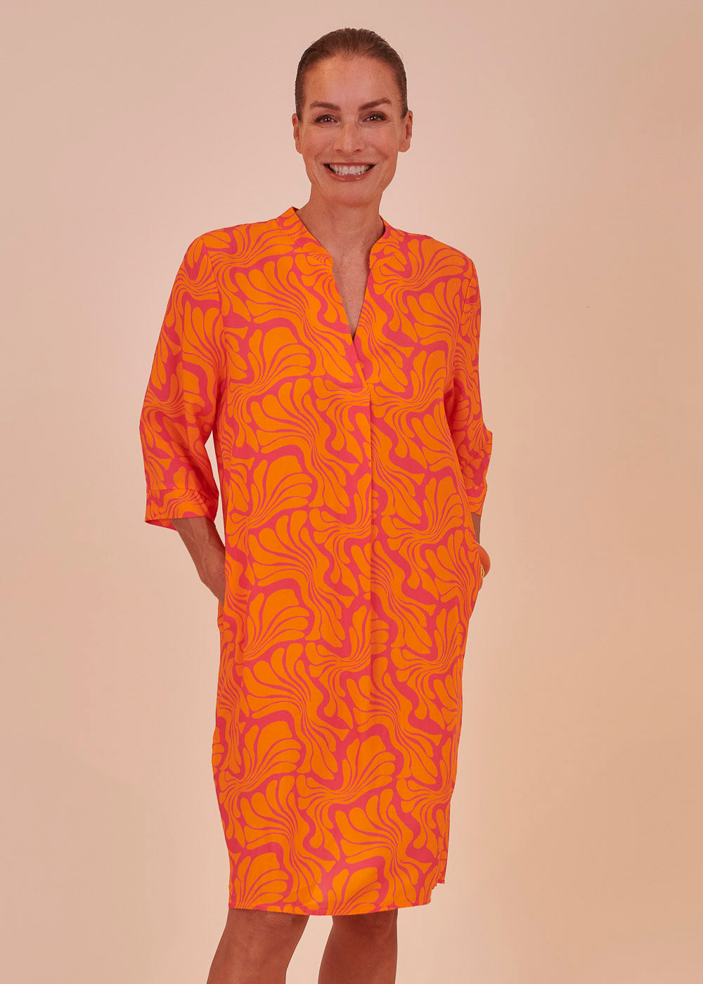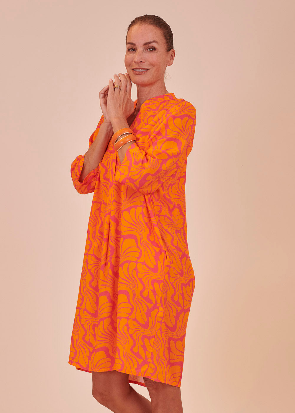 Ein Traum in Orange! Dieses sommerliche Kleid erstrahlt in frischen neuen Trendfarben und einem All-Over-Print. Das Kleid besitzt einen Stehkragen, sowie  3/4 lange Ärmel. Der fließende Schnitt sorgt für ein luftig-leichtes Tragegefühl.