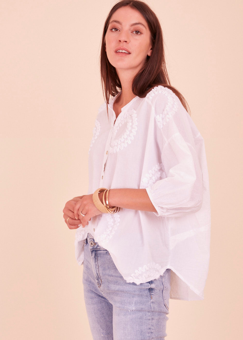 Entdecken Sie unsere wunderschöne bestickte Bluse - eine bezaubernde Verbindung von zeitloser Eleganz und handwerklicher Finesse. Diese Bluse ist eine Hommage an die Kunst der Stickerei und verkörpert raffinierten Stil, der jeden Look aufwertet. Unsere bestickte Bluse besteht aus hochwertiger, leichter Baumwolle, die ein angenehmes Tragegefühl und eine luftige Leichtigkeit bietet. Das zarte Gewebe schmiegt sich sanft an die Haut und sorgt dafür, dass Sie sich den ganzen Tag über wohl und frei fühlen.