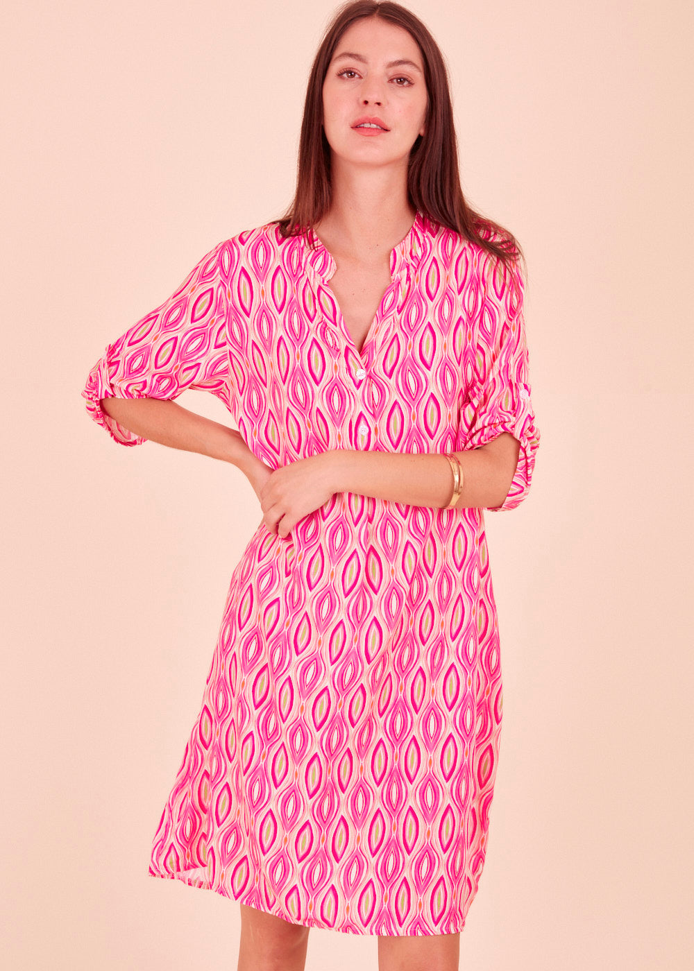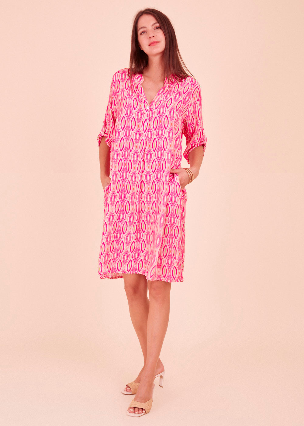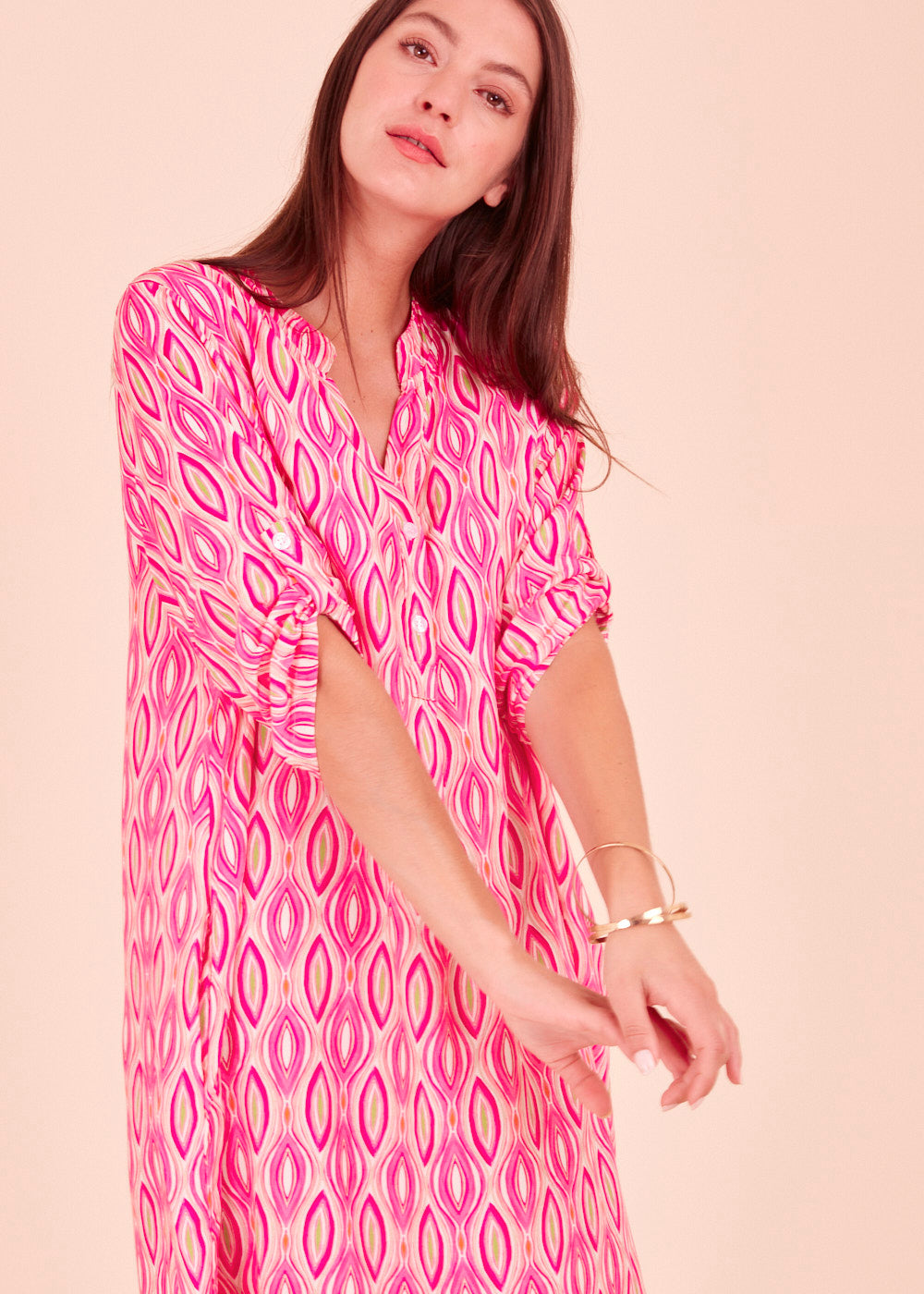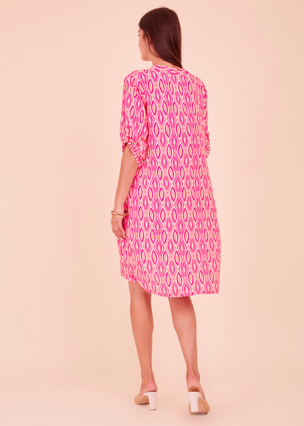Dieses Kleid erstrahlt in frischen Print. Das aufregende Muster in Pink verleiht diesem Kleid eine fesselnde und gleichzeitig verspielte Note. Es ist der ideale Begleiter für schöne Sommertage, Partys oder einen unvergesslichen Abend mit Freunden.