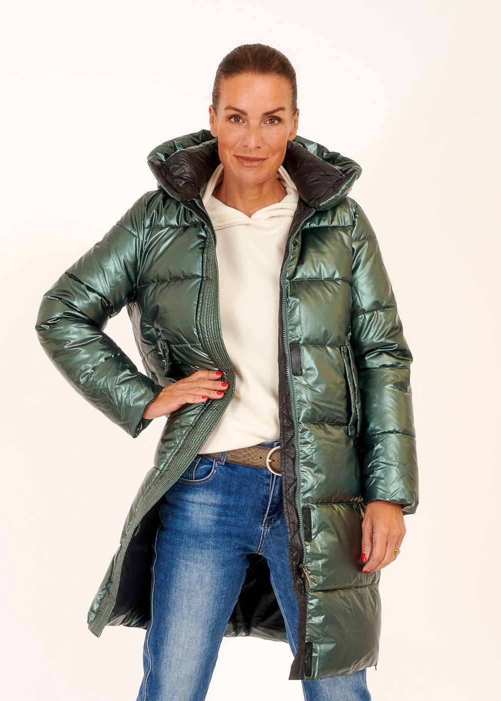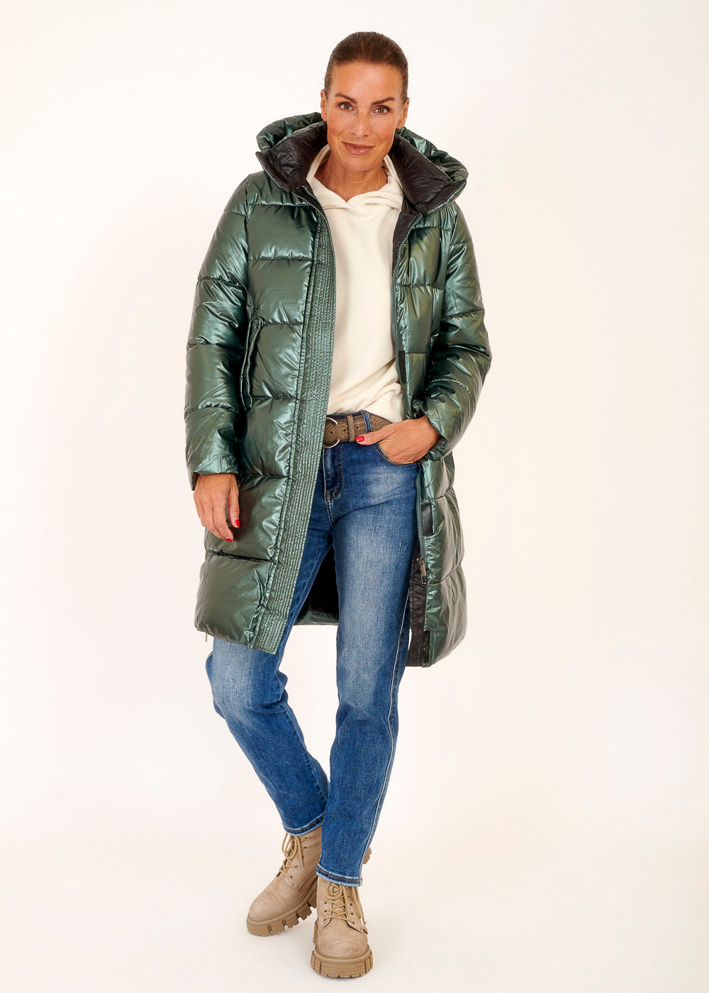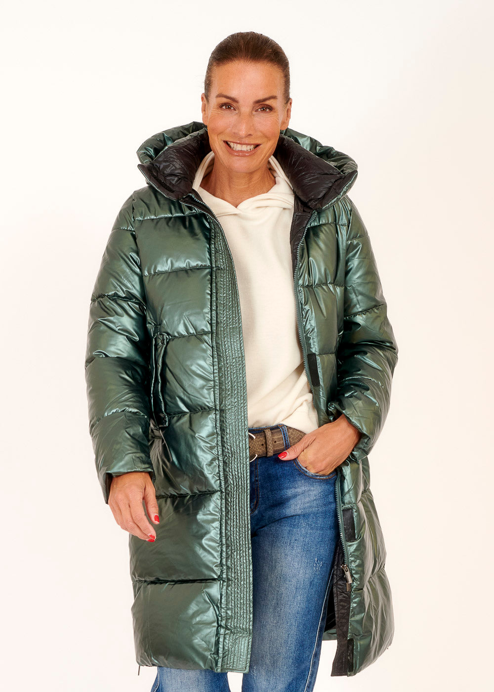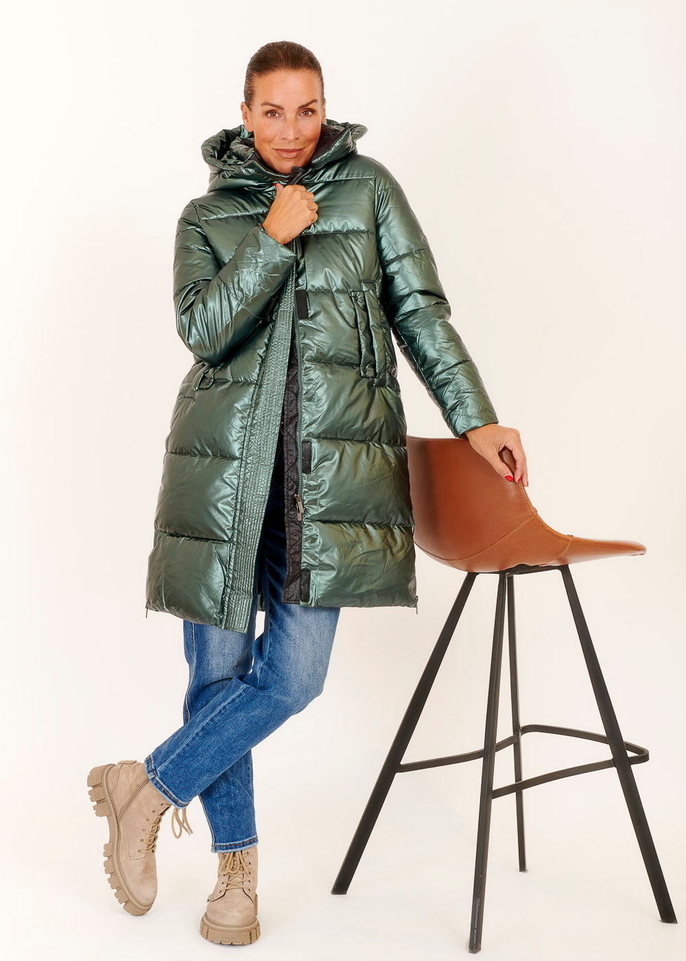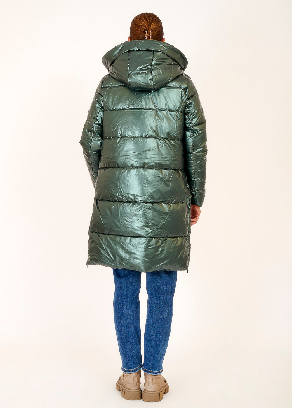 Entdecke unseren Mantel in einem strahlenden Metallic-Grün - das ultimative Statement-Stück für deine Garderobe! Dieser Mantel verleiht deinem Outfit einen Hauch von Extravaganz und wärmt angenehm deinen Körper.