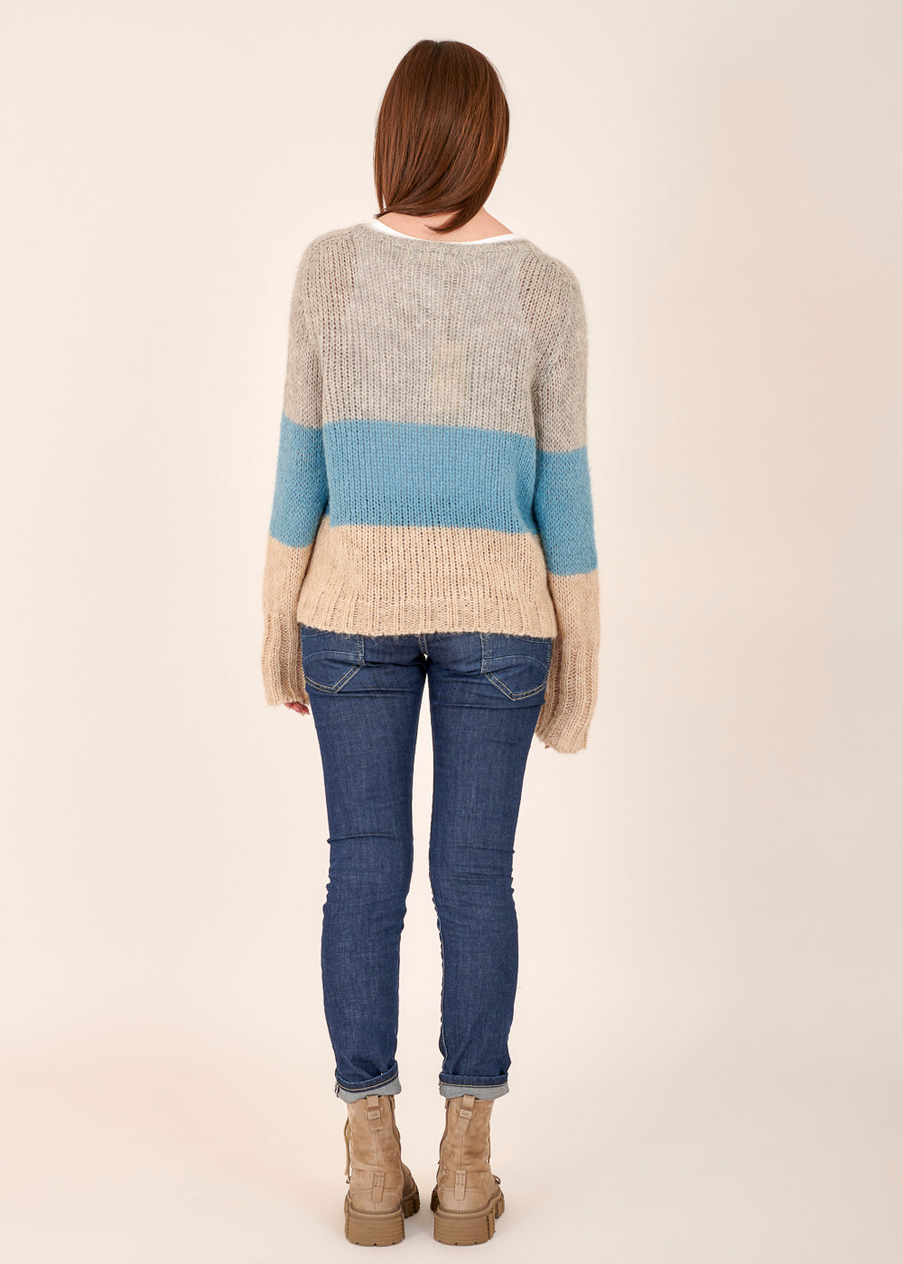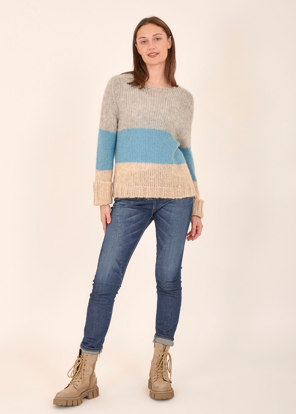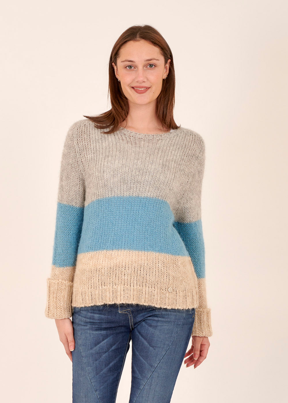 Der Blockstreifenpullover in drei Farben ist ein vielseitiges und modisches Kleidungsstück, das sowohl Stil als auch Komfort bietet. Mit seinen auffälligen Blockstreifen und der Auswahl aus drei verschiedenen Farbvarianten ist dieser Pullover eine großartige Ergänzung für die Herbst- und Wintergarderobe. Dabei schmiegt sich das weiche Material angenehm an deinen Körper an.