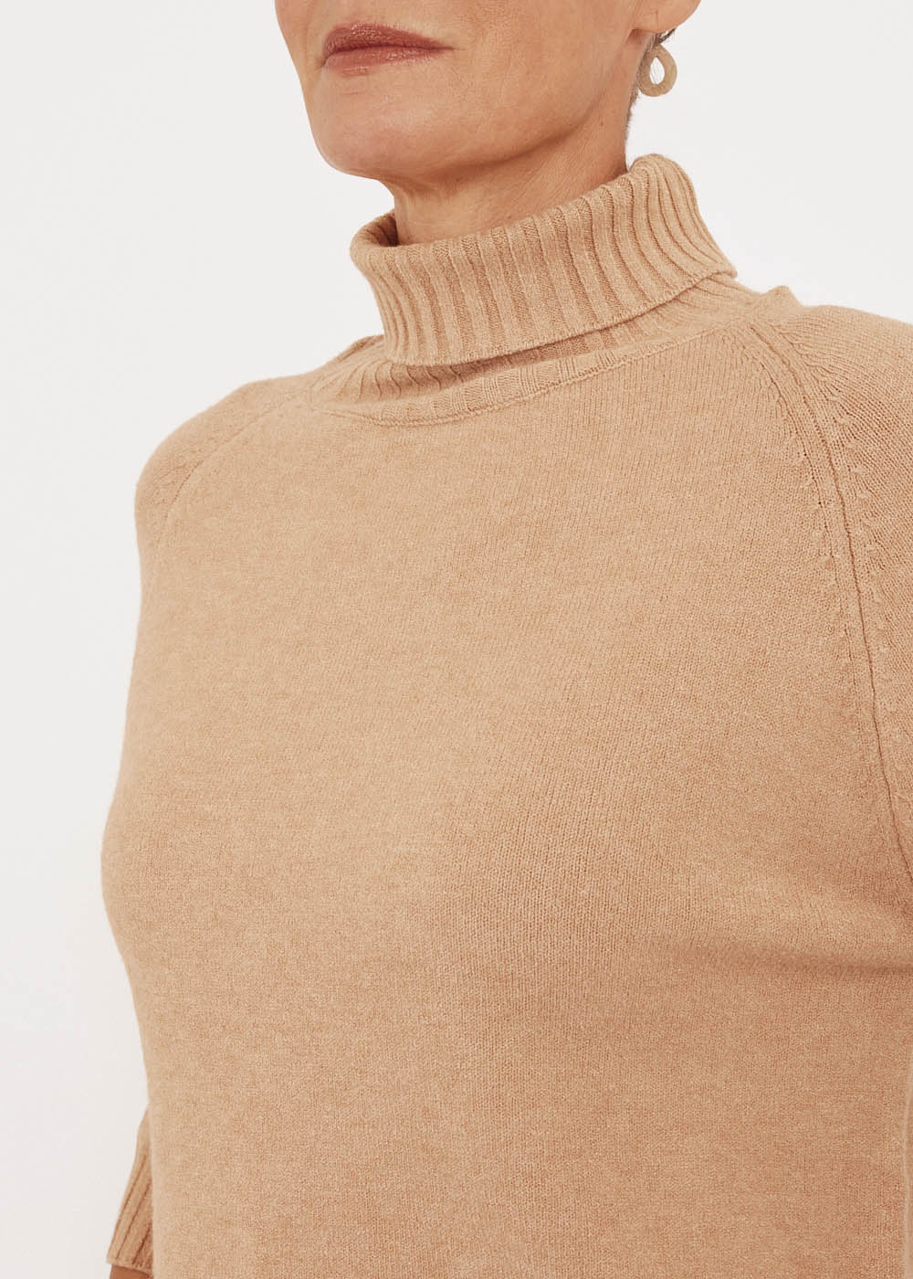 Unser Strickliebling! Kastig geschnittener Strickpullover mit Rollkragen aus unserem Viskose-Kuschelgarn. Mit Rippenbündchen am Kragen und am Ärmelnabschluss. Mit 3/4-Arm.