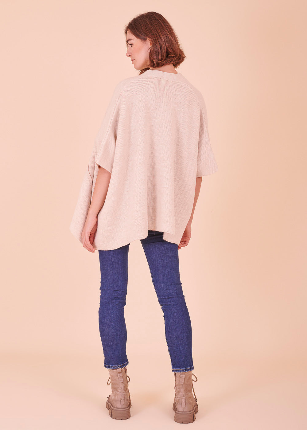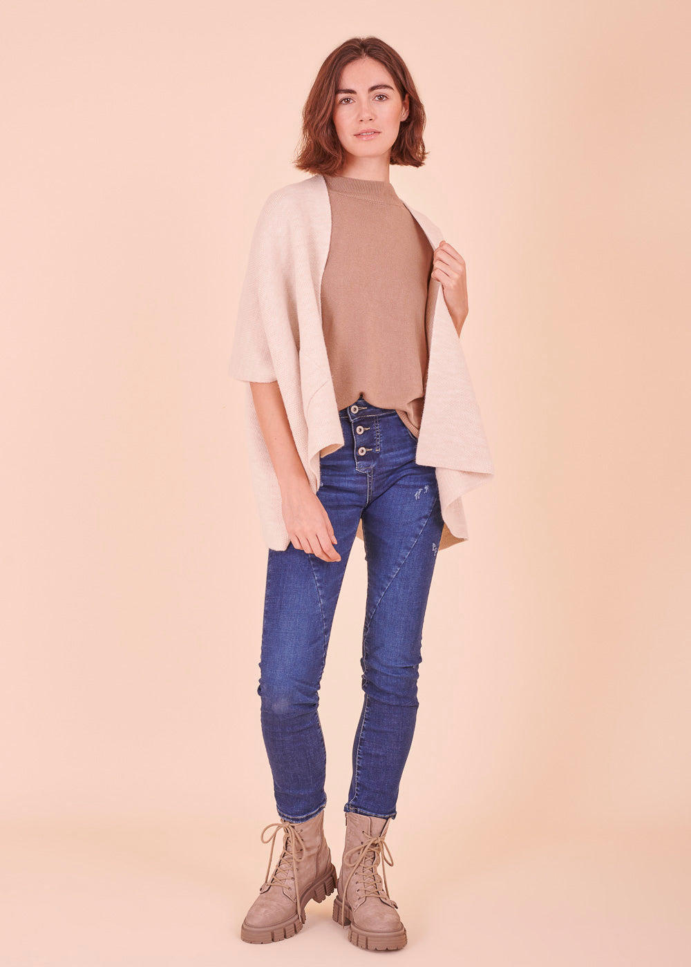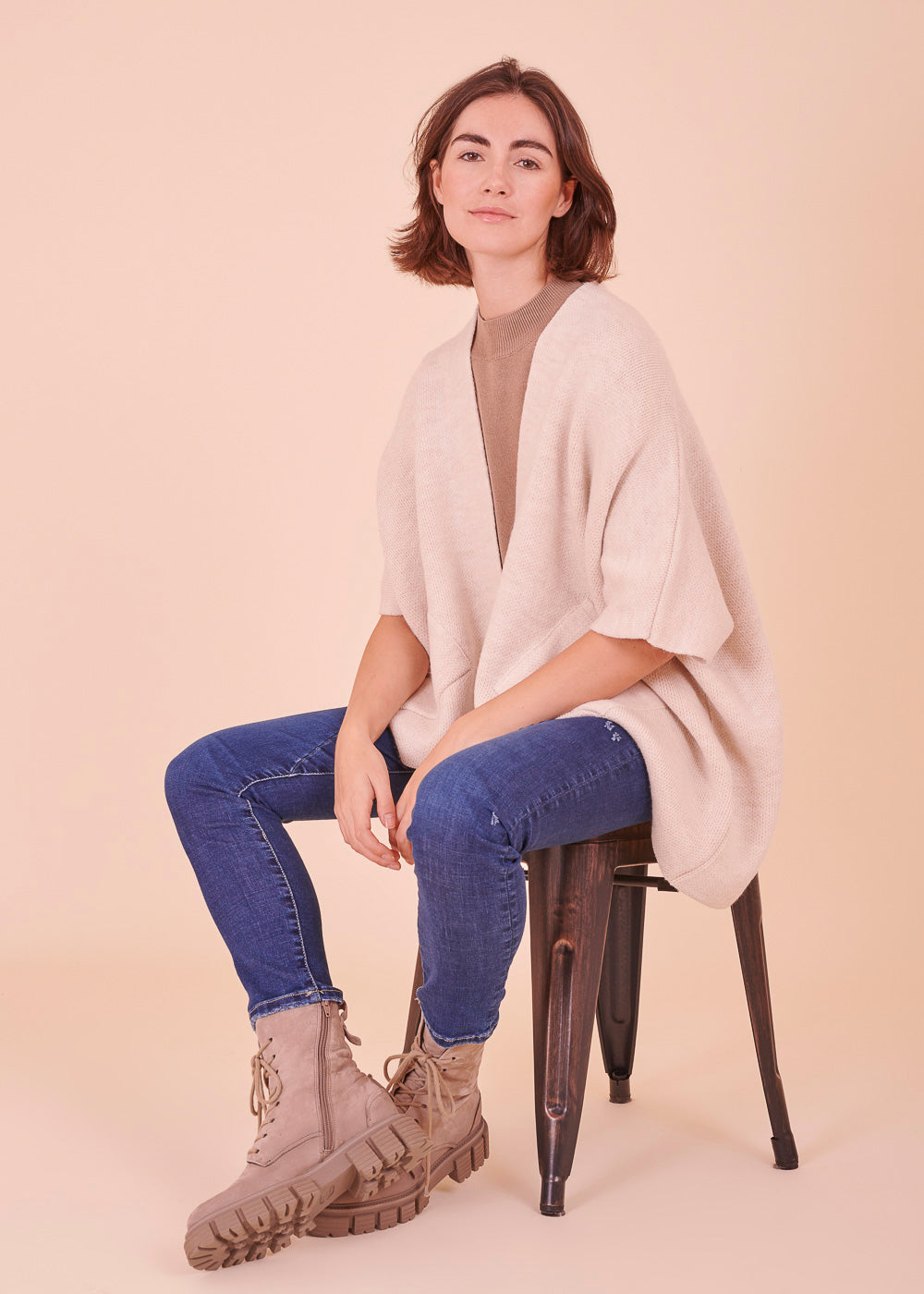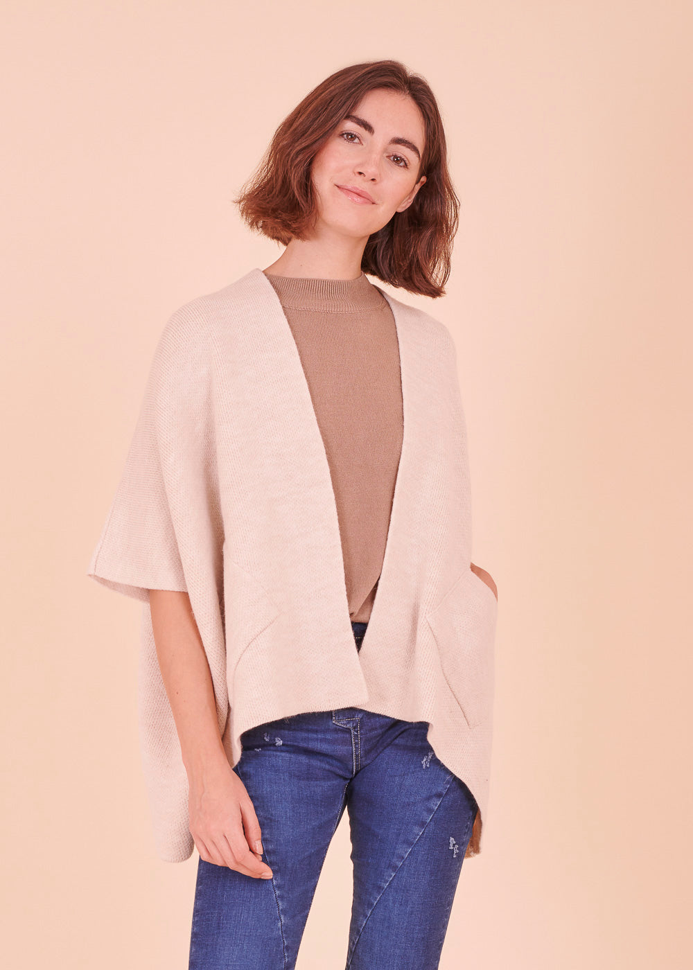 Wundervoller Mantella aus Strick mit seitlichen Eingriffstaschen. Ein wunderbarer Kombinationsartikel. Die kurze Strickjacke ist mit einer offenen Front gestaltet, die einen mühelosen Look ermöglicht. Sie können sie einfach überwerfen, um Ihren Stil zu vervollständigen, sei es für einen lässigen Spaziergang im Park oder einen Abend mit Freunden.