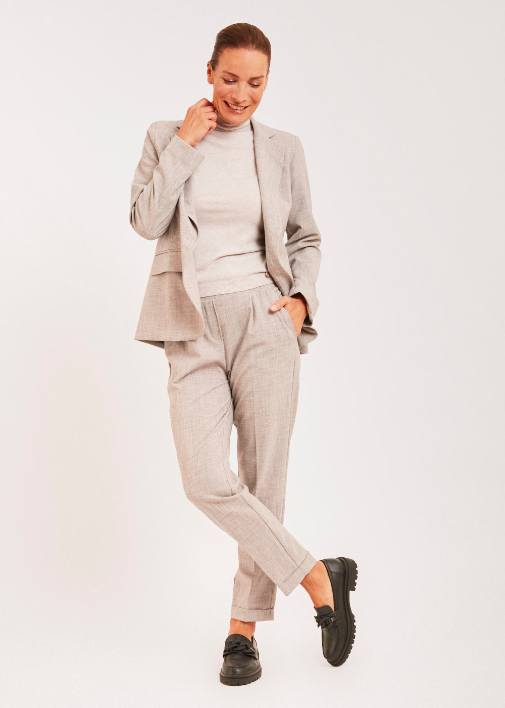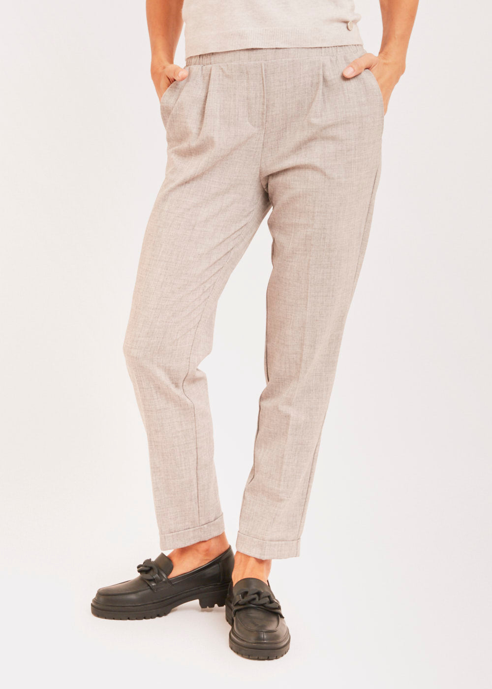 Tolle Bundfaltenhose mit geradem Bein. Die Hose sitzt besonders lässig durch seinen Gummizug und hat seitliche Eingriffstaschen. Besonders toll in Kombination mit dem passenden Blazer und einer weißen Bluse. Einfach lässig und stylisch.