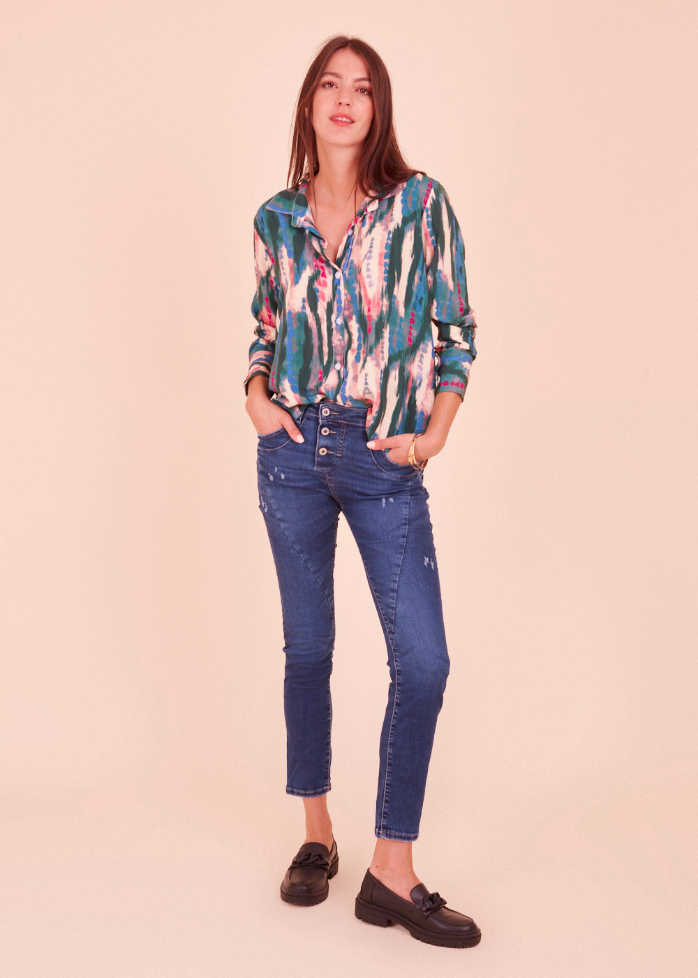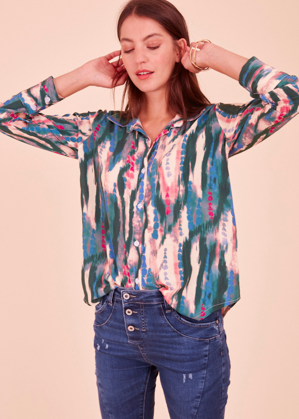 Zauber dir deine neue Lieblingsbluse in deinen Kleiderschrank. Durch diese fließende leichte Viskosebluse in einem zauberhaften Farben, zauberst du dir ein Strahlen ins Gesicht. Diese gemusterte Bluse im Stehkragen Stil ist lässig geschnitten. Die frischen Farben verleihen deinem Look die perfekte Frische. Einfach besonders!