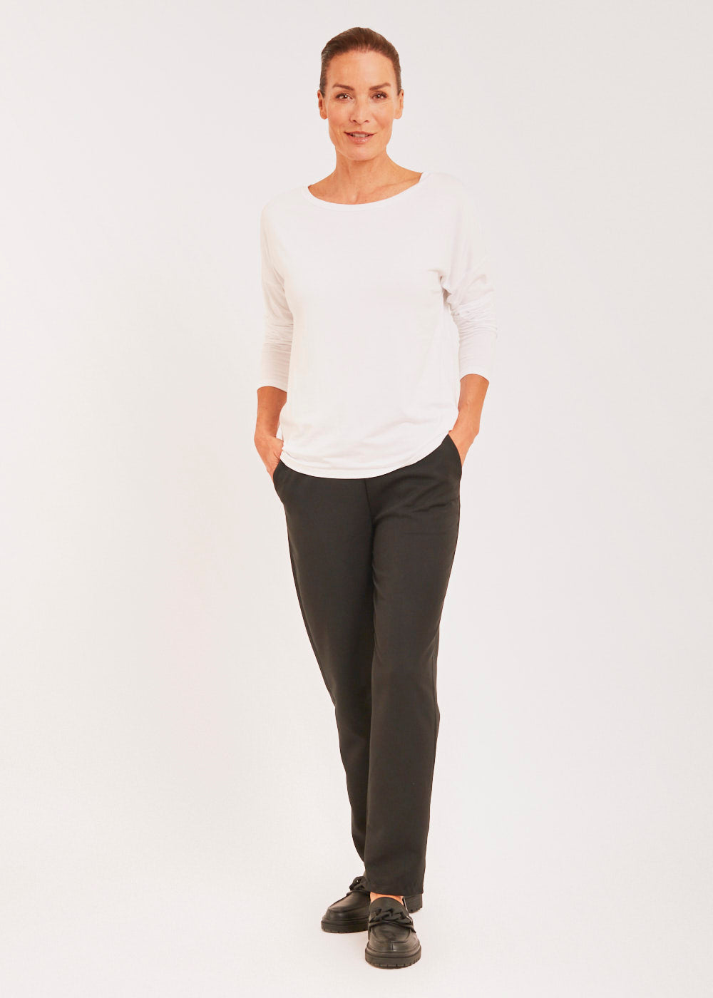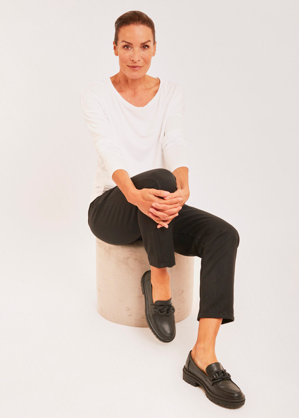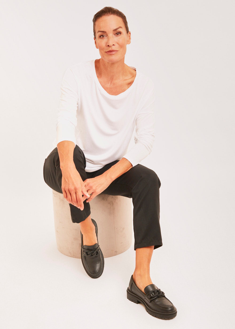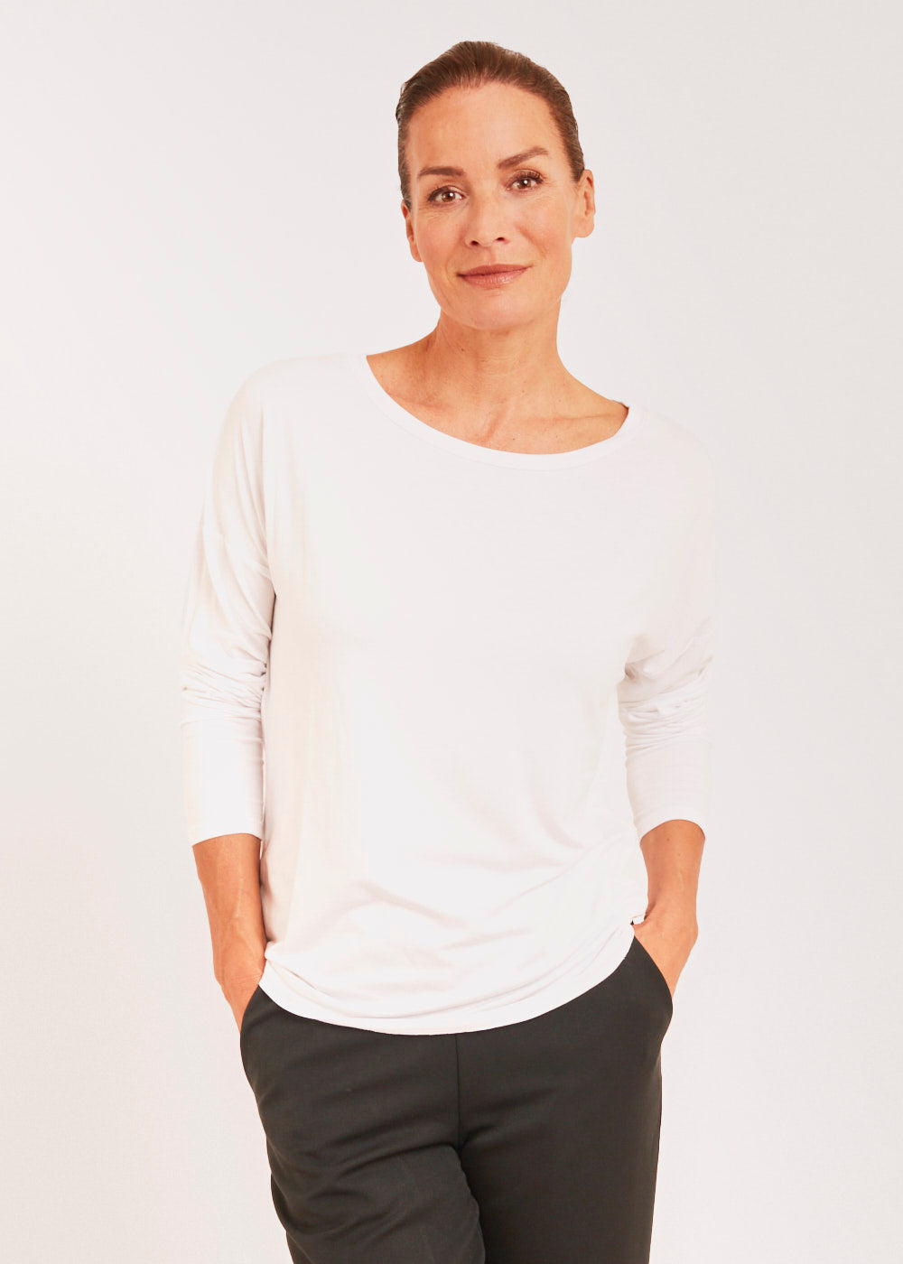 Dieses Shirt ist für viele Ihrer Kombi-Ideen die perfekte Wahl! Mit klassischem Rundhals-Ausschnitt, leicht abgerundetem Saum und langen Ärmeln. Passt auch unter viele Westen und Jäckchen.
