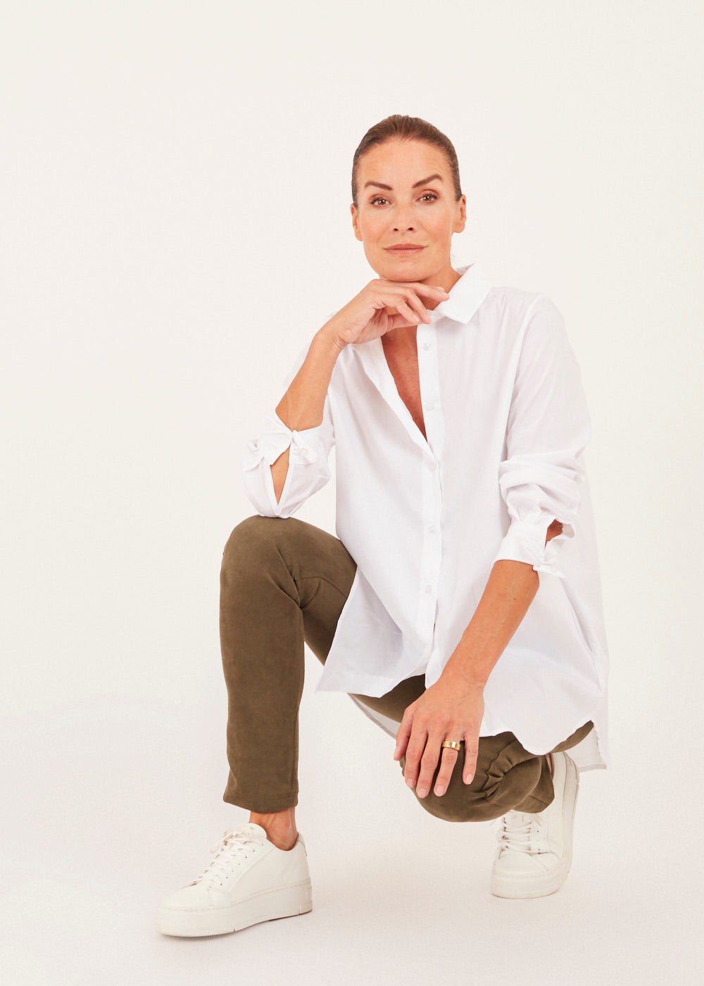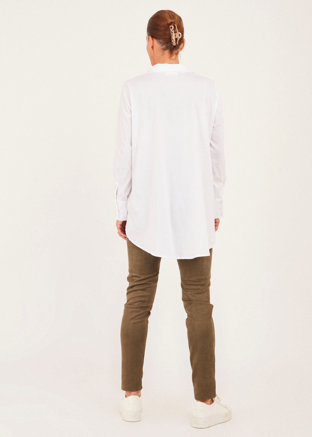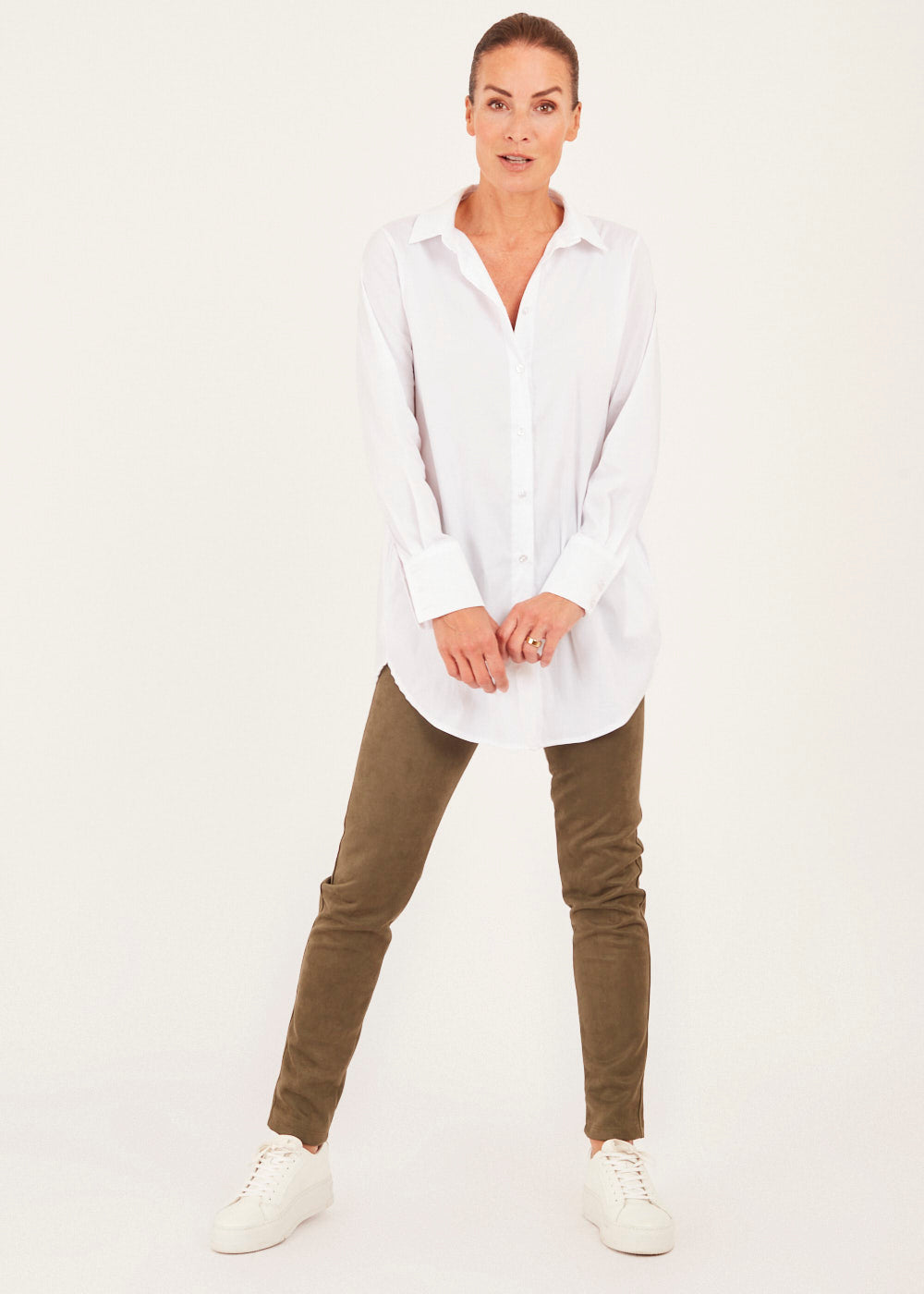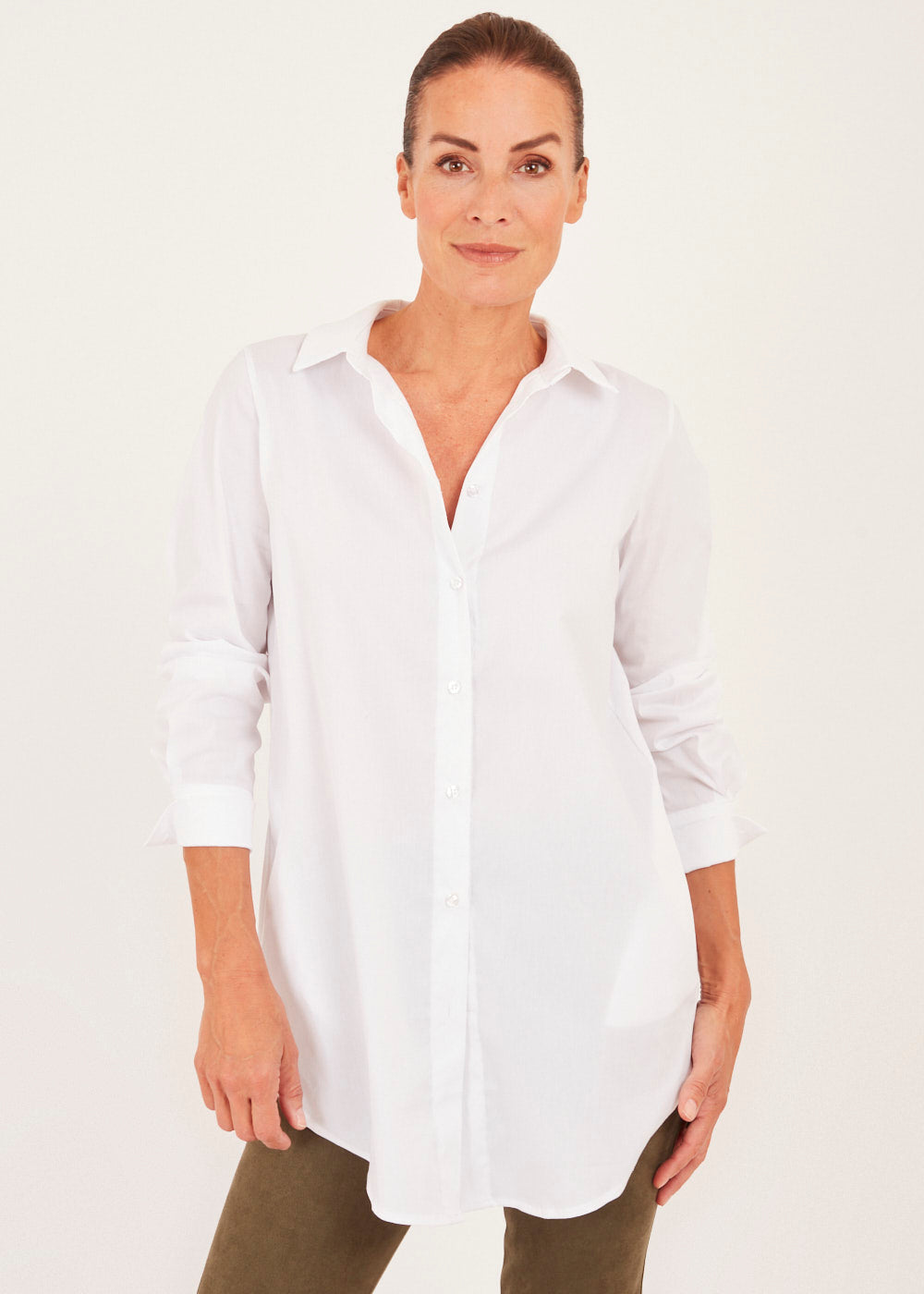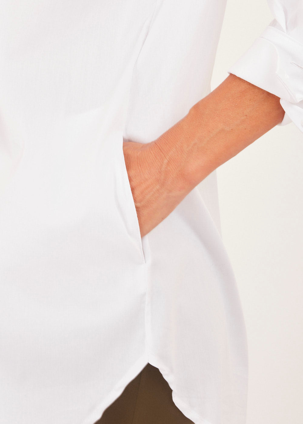 Lässiggeschnittene Bluse mit seitlichen Eingriffstaschen. Hemdbluse aus Baumwolle. Modell mit Kragen, Knopfleiste, überschnittenen Schultern und langen Ärmeln mit geknöpften Manschetten.