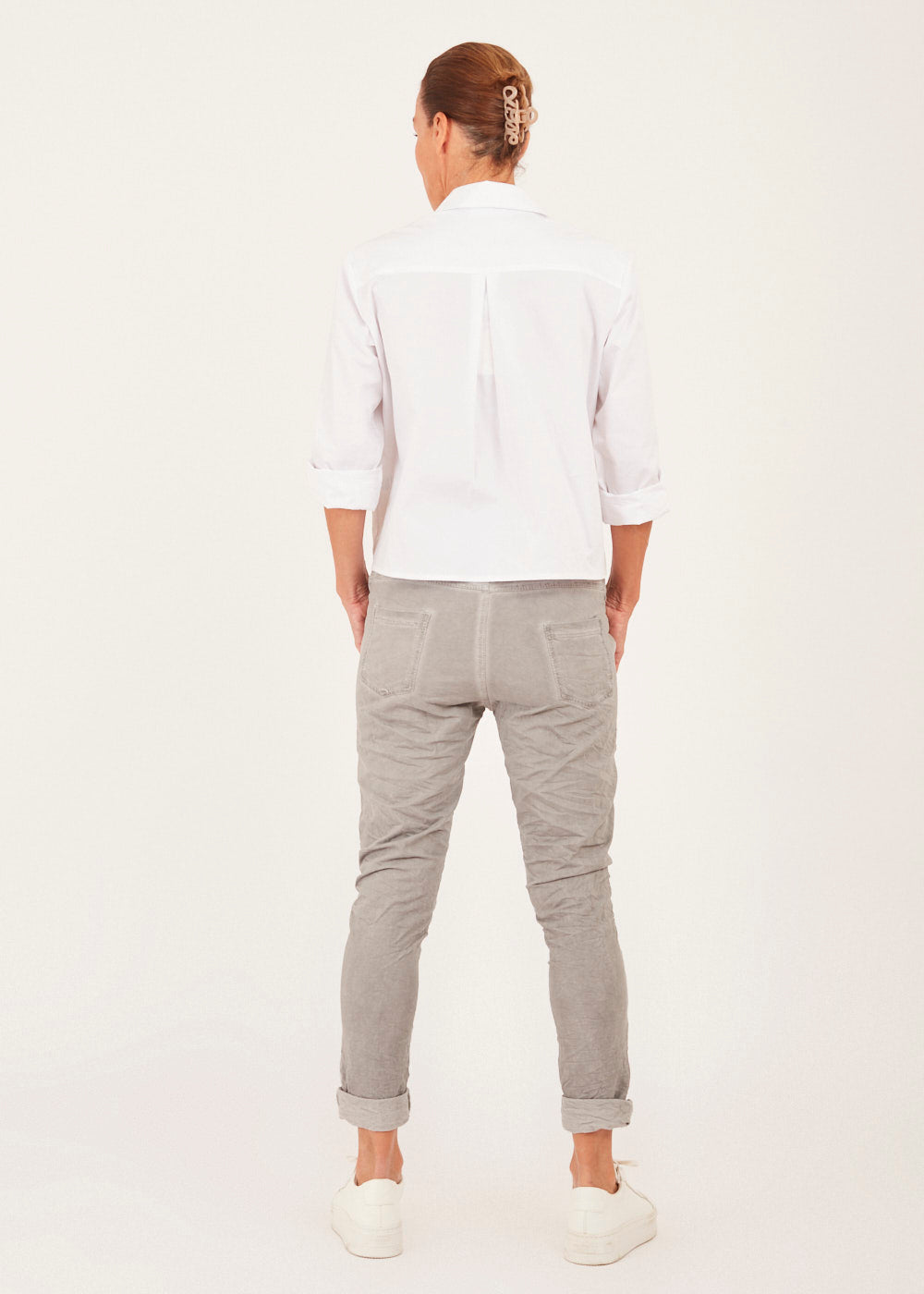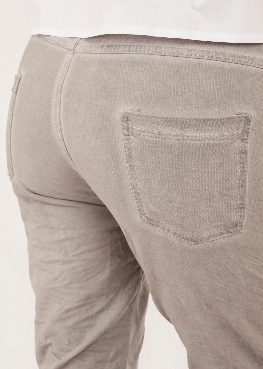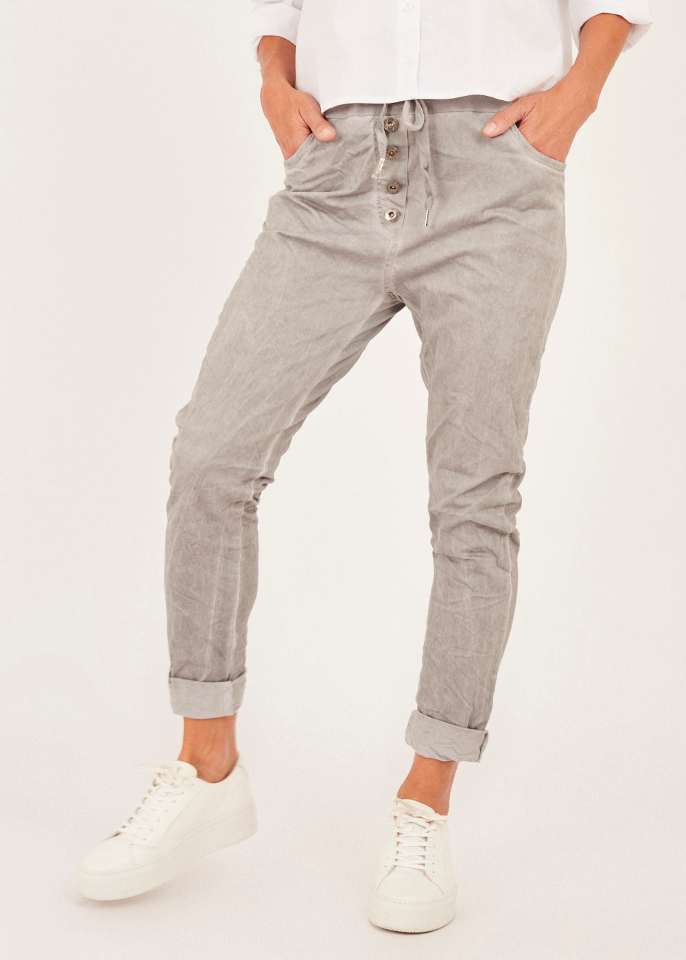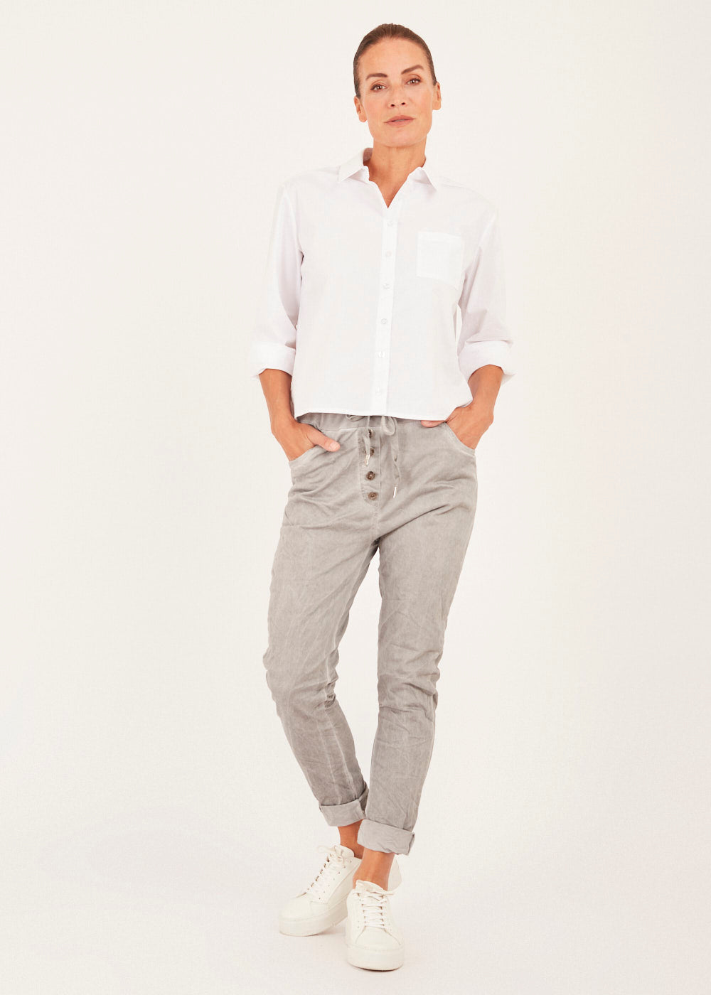 Unser Bestseller in der neuen Trendform mit seitlichen Eingriffstaschen. Hose aus Viskose und Elasthan-Anteil. Dadurch sitzt sie super bequem und lässt sich prima zu Allem kombinieren. Gummizug im Bund, Tunnelzug mit Band und seitliche Eingriffstaschen und dekorativen Knopfleiste.