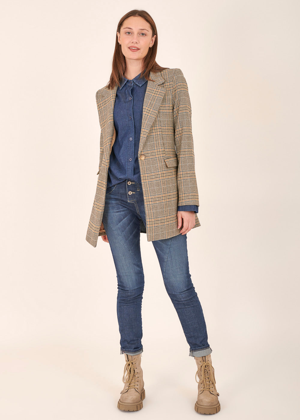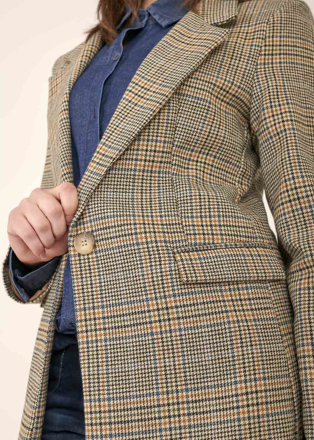 Unser Longblazer zeichnet sich durch eine Vielzahl von besonderen Merkmalen aus, die ihn von anderen Blazern abheben. Der taillierte Schnitt sorgt für eine schmeichelhafte Passform und betont deine Silhouette. Die Knopfleiste und die seitlichen angedeuteten Taschen verleihen dem Blazer eine praktische Note, ohne dabei den Stil zu beeinträchtigen. Die hochwertige Verarbeitung gewährleistet Langlebigkeit und Tragekomfort. Der Longblazer im Glencheck Design ist äußerst vielseitig. Trage ihn über einem schlichten Hemd oder einer Bluse für einen eleganten Bürolook, oder kombinieren ihn mit Jeans und einem T-Shirt für einen entspannten, aber dennoch stilvollen Freizeitlook. Er eignet sich auch hervorragend als Teil eines schickeren Ensembles für formellere Anlässe.