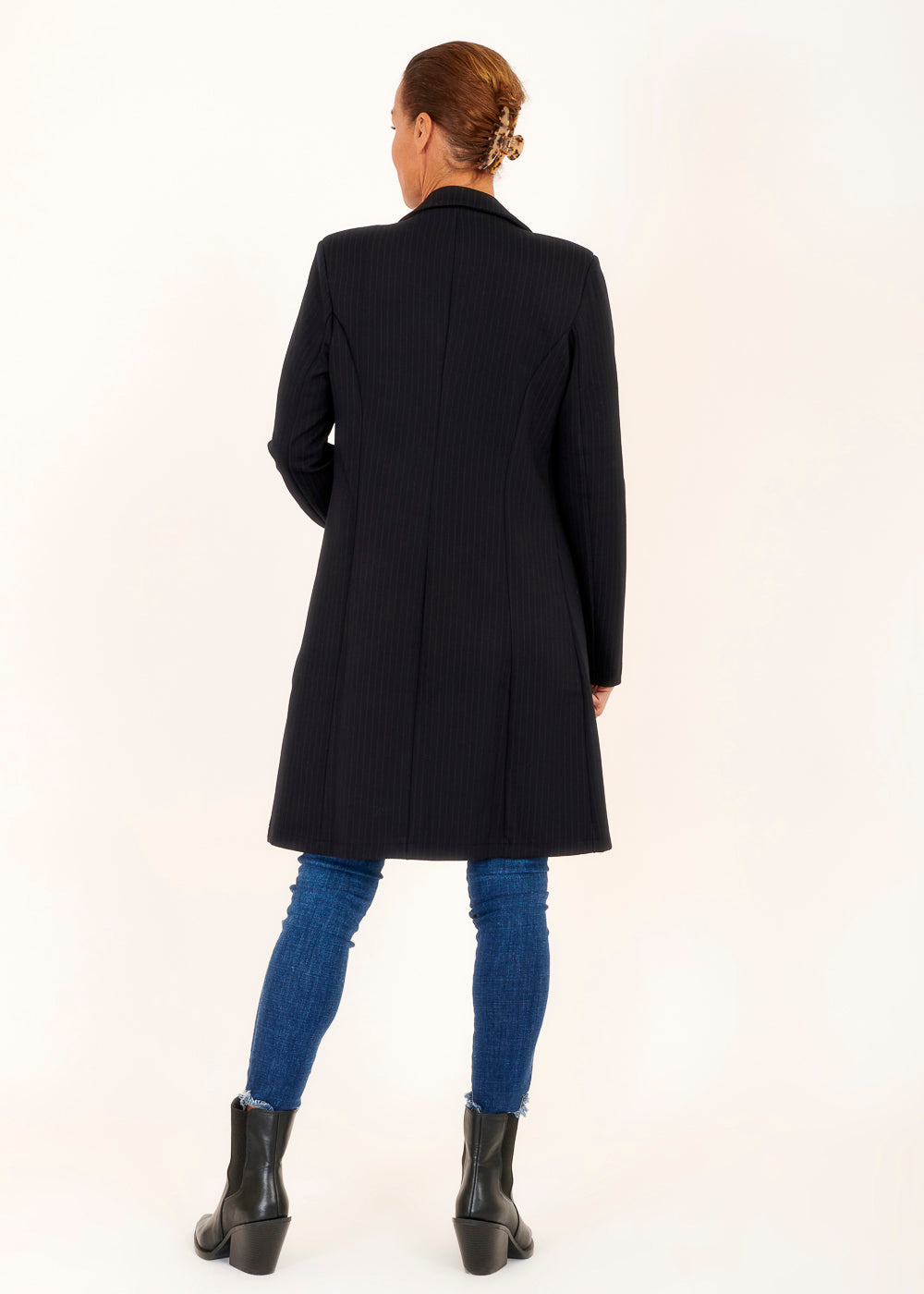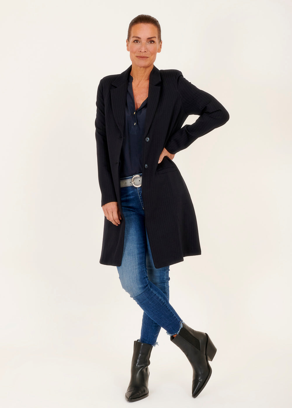 Dieses exklusive Kleidungsstück verkörpert italienischen Stil und raffinierte Klasse in Perfektion. Die feinen Nadelstreifen verleihen dem Longblazer eine subtile Eleganz, die sich mühelos in verschiedene Anlässe integriert.
