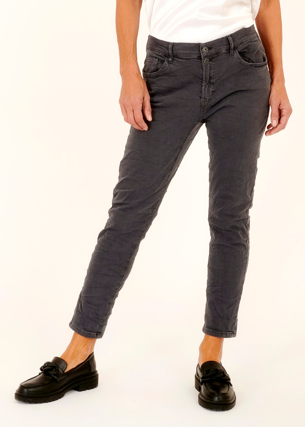 Boyfriend-Fit Jeans . Sie sitzt locker auf den Hüften und eine Knopfleiste mit 2 Metallknöpfen vorn. Klassischer 5-Pocket Stil, mit dem einem hohen Elasthan Anteil. Einfach zum wohlfühlen.