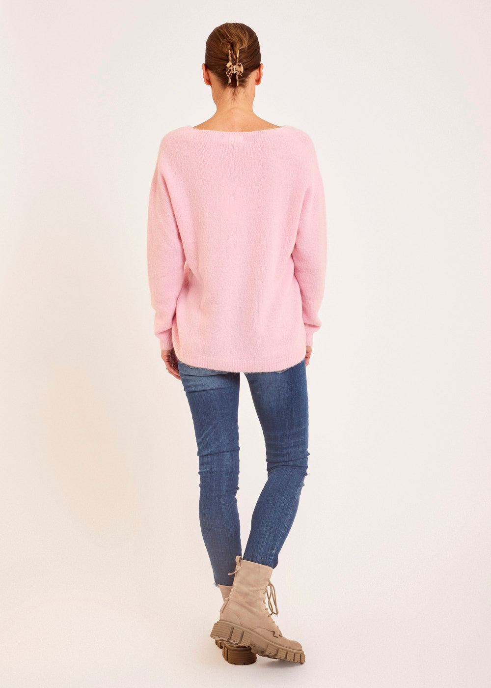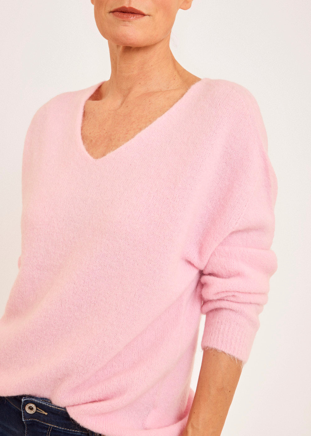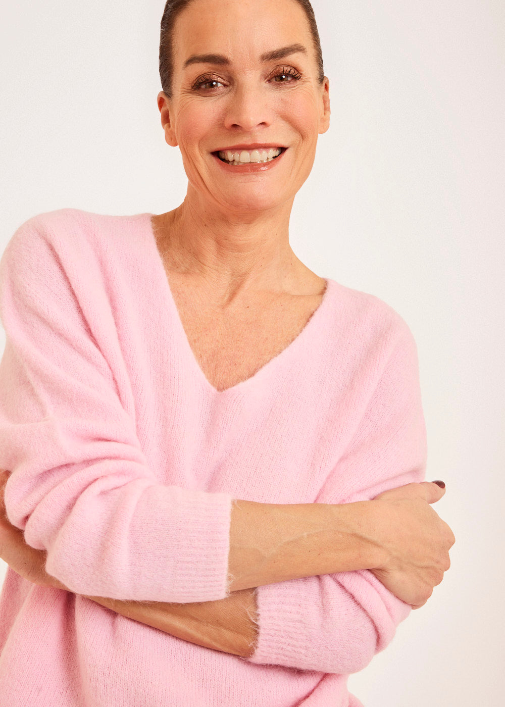 Gemütlicher lässiger V-Ausschnitt Pullover in einem wunderschöne Rosa Ton. Der gemütliche Schnitt dieses Pullovers sorgt für eine entspannte und lockere Passform. Er ist kuschlig weich, aus einem Baby Alpaka Mix. Unser Pullover Liebling!Der gemütliche Schnitt sorgt für eine entspannte und lockere Passform, die sich ideal für jeden Tag eignet. Ob du ihn zu Jeans für einen entspannten Look oder zu einer schickeren Hose für einen lässig-eleganten Auftritt kombinierst – dieser Pullover ist vielseitig einsetzbar.