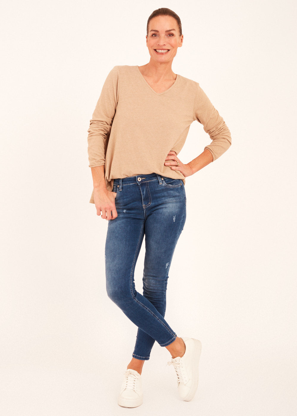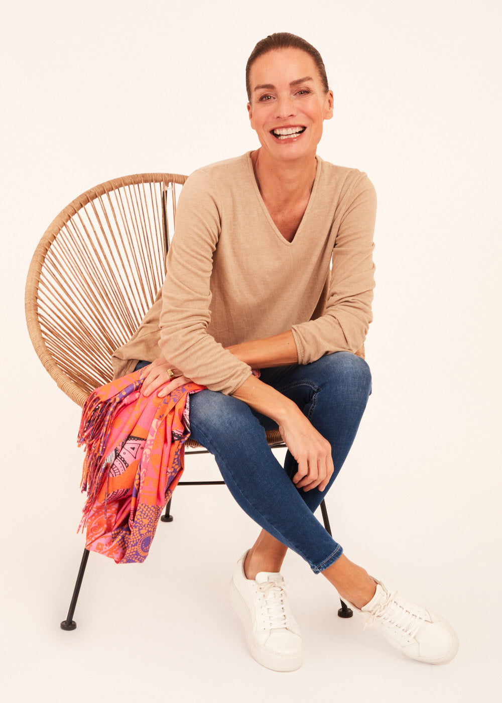 Mit seinem kuscheligen Charme wird dieses V-Shirt schnell zu Ihrem Lieblingsstück im Kleiderschrank. Setzen Sie auf Wohlfühlmomente und Stil mit unserem beige-farbenen kuscheligen V-Shirt.