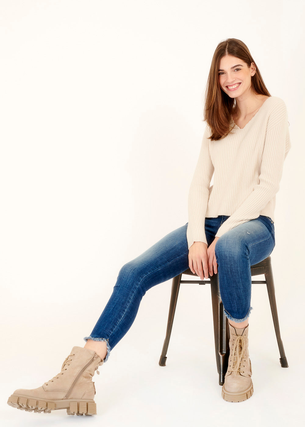 Ob kombiniert mit Jeans für einen lässigen Alltagslook oder mit einer eleganten Hose für einen schickeren Anlass, dieser beigefarbene Rippenpullover ist die perfekte Wahl für einen modernen und stilsicheren Auftritt.