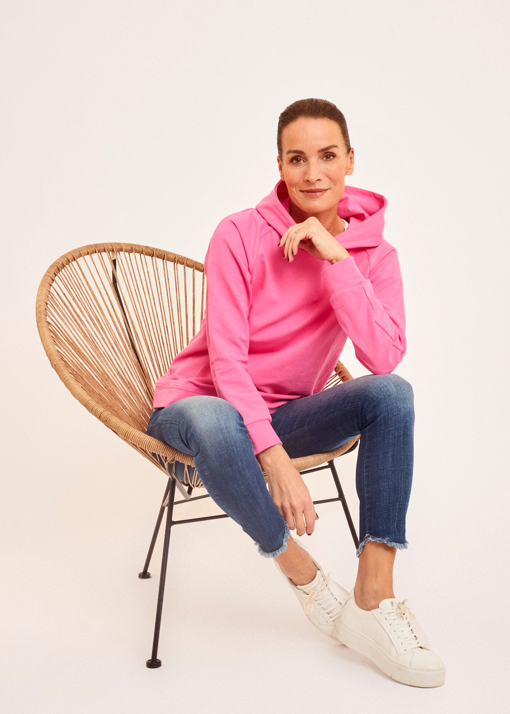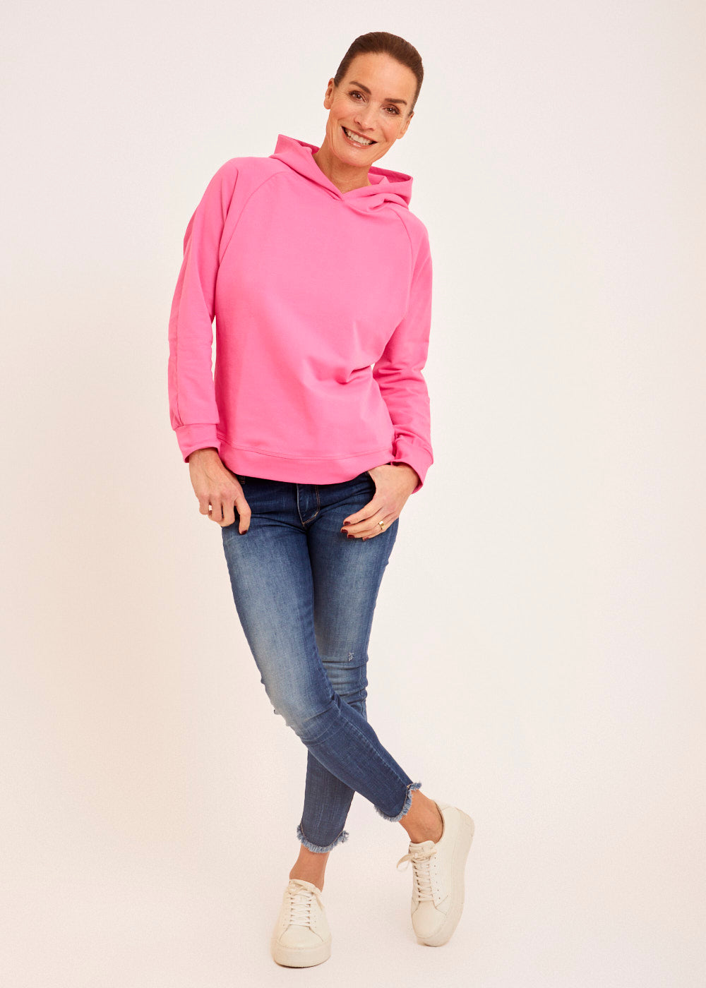 Bequemer Kapuzenpullover mit gerippten Bündchen in der Trendfarbe Fuxia. Die Kapuze sorgt nicht nur für einen lässigen Look, sondern bietet auch zusätzlichen Schutz vor Wind und Wetter. Der bequeme Schnitt und die elastischen Bündchen gewährleisten eine optimale Passform und lassen dich immer gut aussehen.Der Hoodie besteht aus hochwertiger Baumwolle, die ein weiches und angenehmes Tragegefühl garantiert. Die lebendige pinke Farbe verleiht deinem Look eine frische und feminine Note, perfekt für jede Jahreszeit. Egal, ob du ihn im Frühling als leichten Überwurf oder im Herbst als gemütliche Schicht trägst – dieser Hoodie passt zu jedem Anlass.