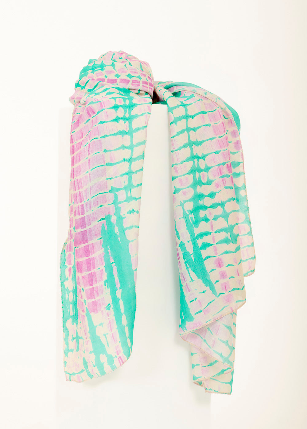 Die Farben Lila und Menta harmonieren subtil und verleihen dem Schal eine sanfte und dennoch auffällige Ausstrahlung. Das Material aus Seide und Viskose verleiht dem Schal einen dezenten Glanz und sorgt für eine luftige Leichtigkeit, ideal für verschiedene Anlässe.