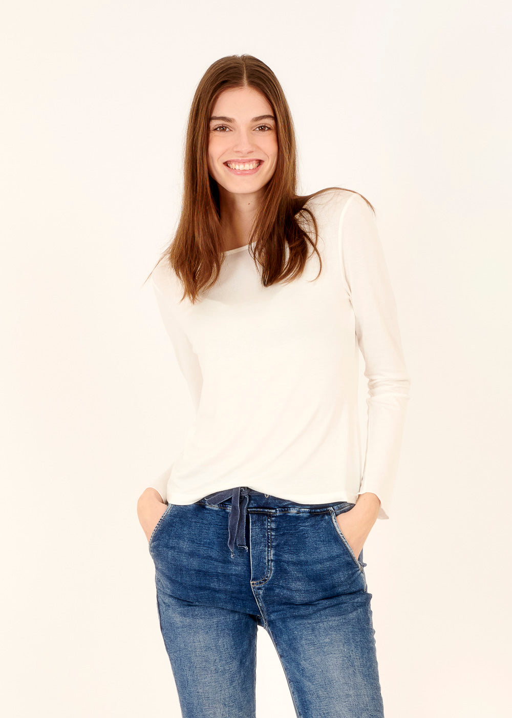 Probier unser weißes Langarmshirt für einen entspannten Look! Das Shirt hat lange Ärmel, um dich warm zu halten, und die weiße Farbe verleiht ihm eine schöne Ausstrahlung. Es ist super bequem und passt gut zu Jeans oder Leggings für einen lockeren Alltagsstil.