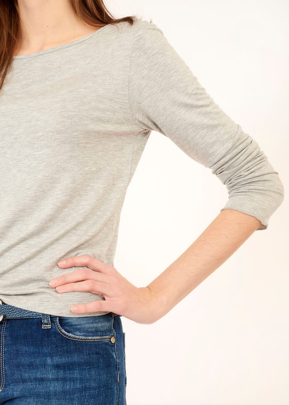 Der sanfte Grauton verleiht dem Langarmshirt eine neutrale Ausstrahlung und macht es zu einem vielseitigen Kleidungsstück. Egal, ob du es lässig zur Jeans oder schicker zu einer Hose kombinierst, dieses Shirt passt sich jedem Stil mühelos an.