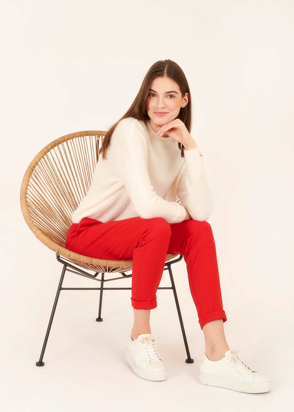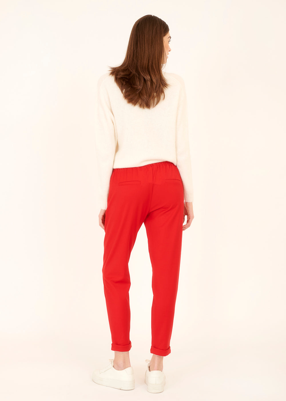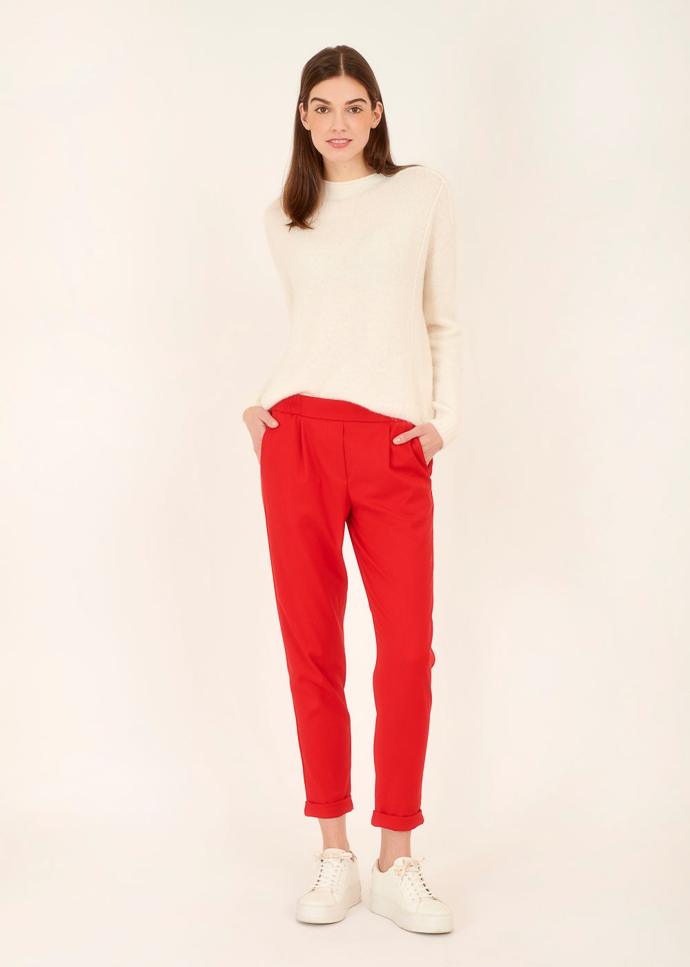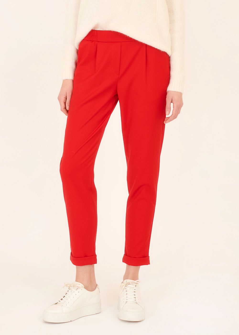Der knallige Rotton setzt ein modisches Statement und die Kombination mit dem Gummizugbund macht diese Hose nicht nur stylisch, sondern auch besonders bequem. Der passende Blazer rundet das Ensemble ab und verleiht dir einen durchdachten, trendigen Look.