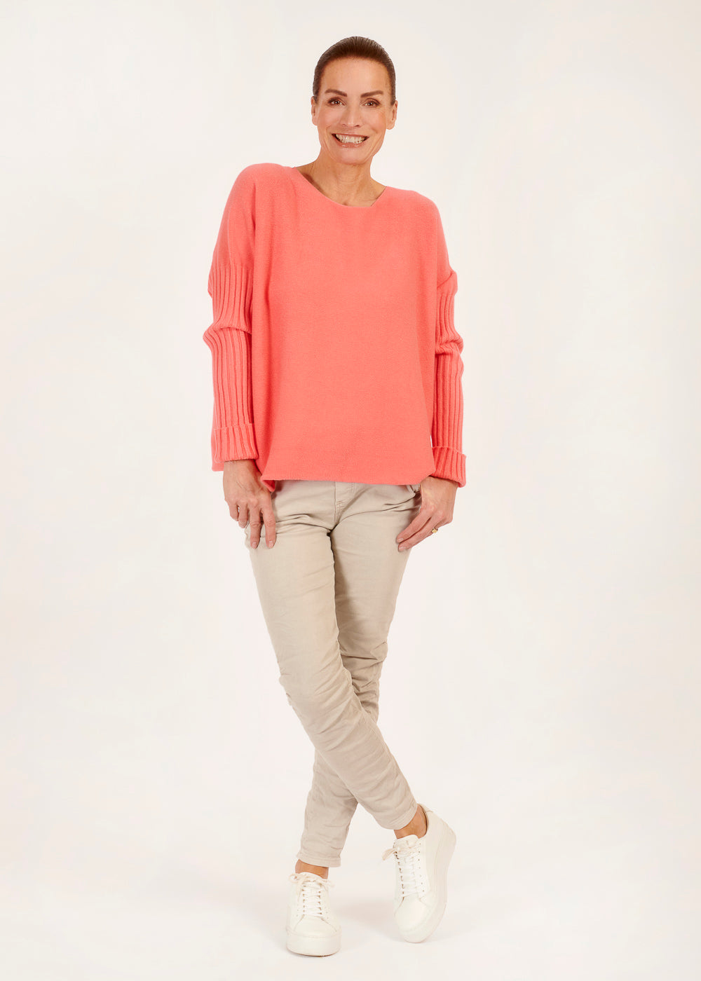 Die lebendige Farbe Koralle macht diesen Pullover zu einem echten Blickfang, der sofort gute Laune verbreitet. Egal, ob du ihn zu deiner Lieblingsjeans für einen entspannten Alltagslook trägst oder zu einer schickeren Hose für einen lässig-eleganten Auftritt kombinierst, dieser Pullover wird garantiert alle Blicke auf sich ziehen.
