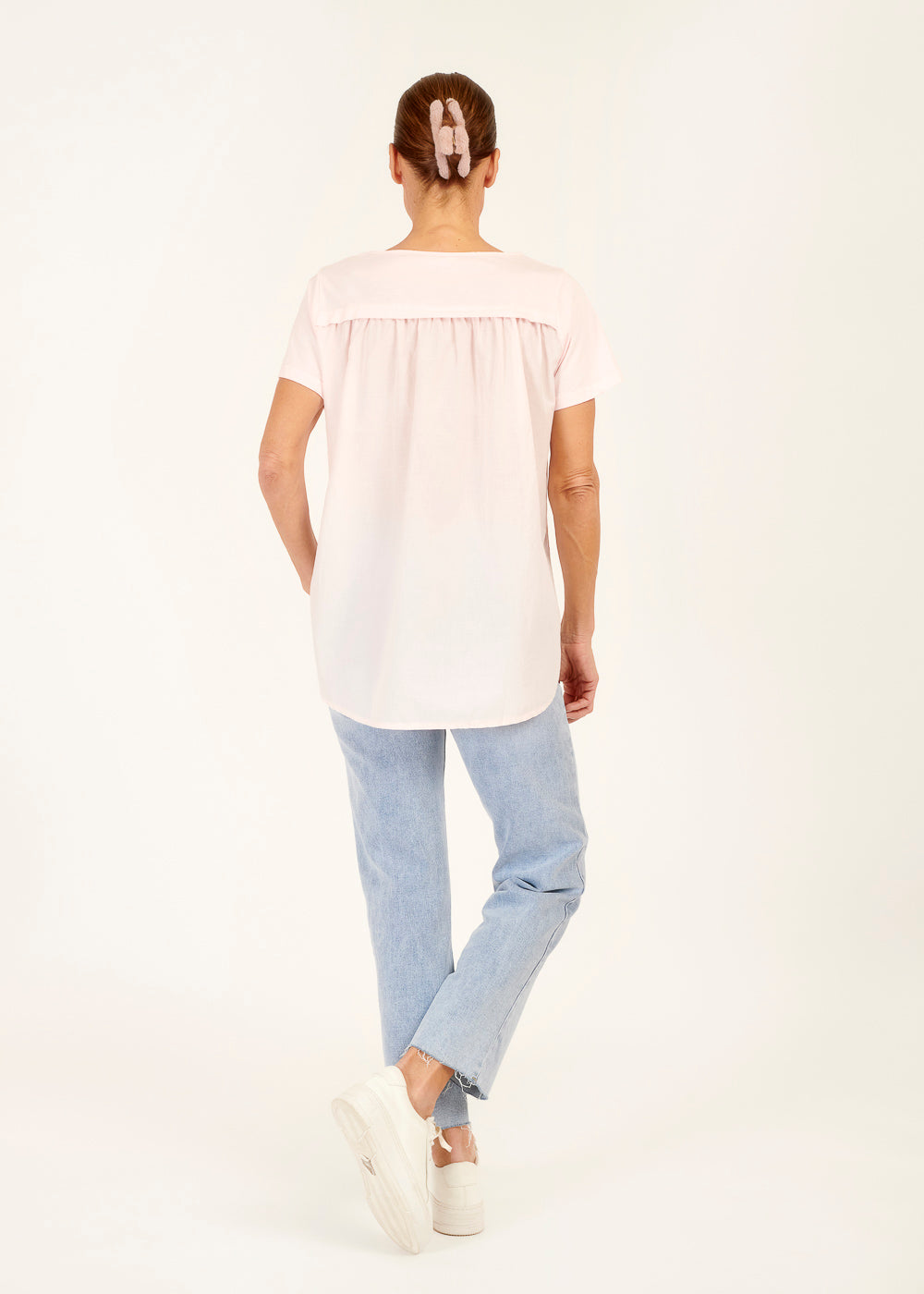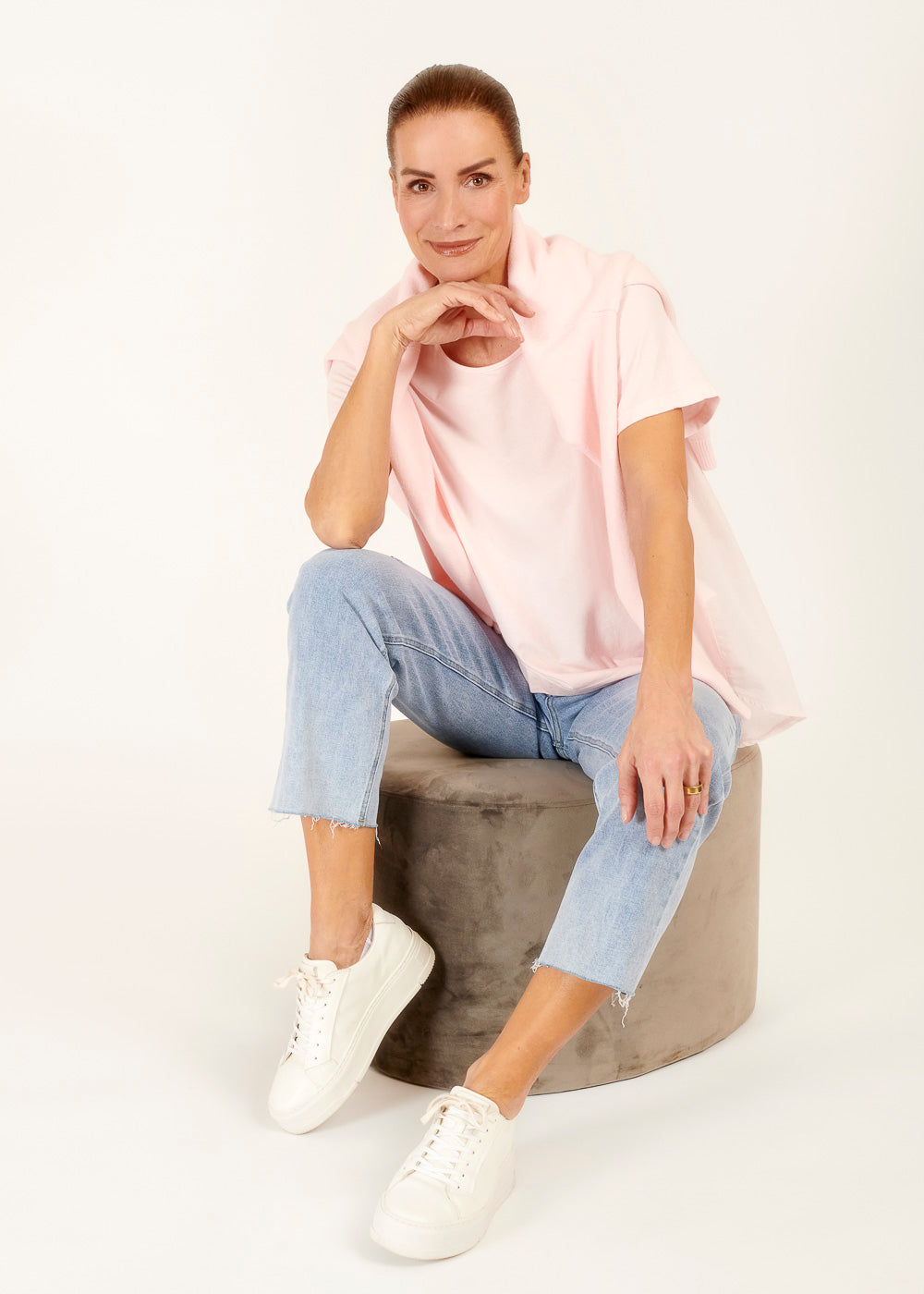 Mit einem einzigartigen Materialmix aus hochwertigen Stoffen ist dieses Shirt nicht nur ein Basic, sondern ein echtes Statement-Piece. Der runde Halsausschnitt verleiht ihm eine zeitlose Eleganz, während die subtilen Raffungen auf der Rückseite für einen Hauch von Raffinesse sorgen.