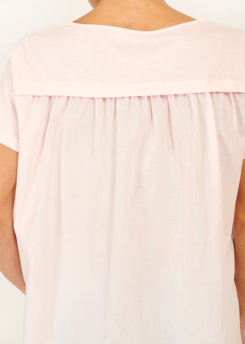 Ein Shirt, das deinen Look auf ein neues Level hebt: Unser Materialmix-Shirt in strahlendem Rosa mit rundem Halsausschnitt und raffinierten Details auf der Rückseite.