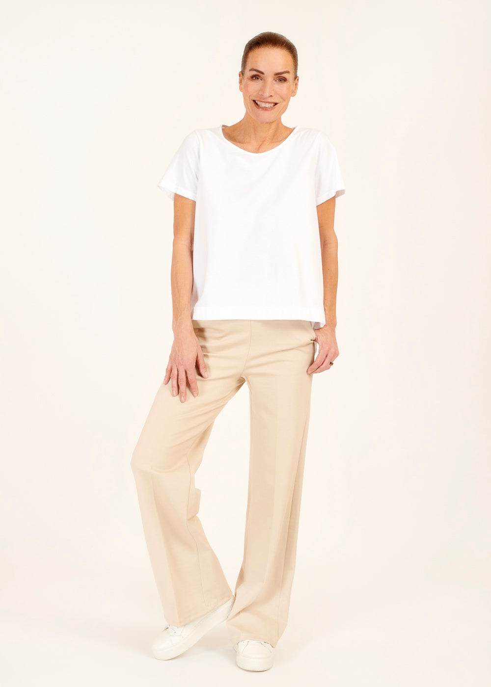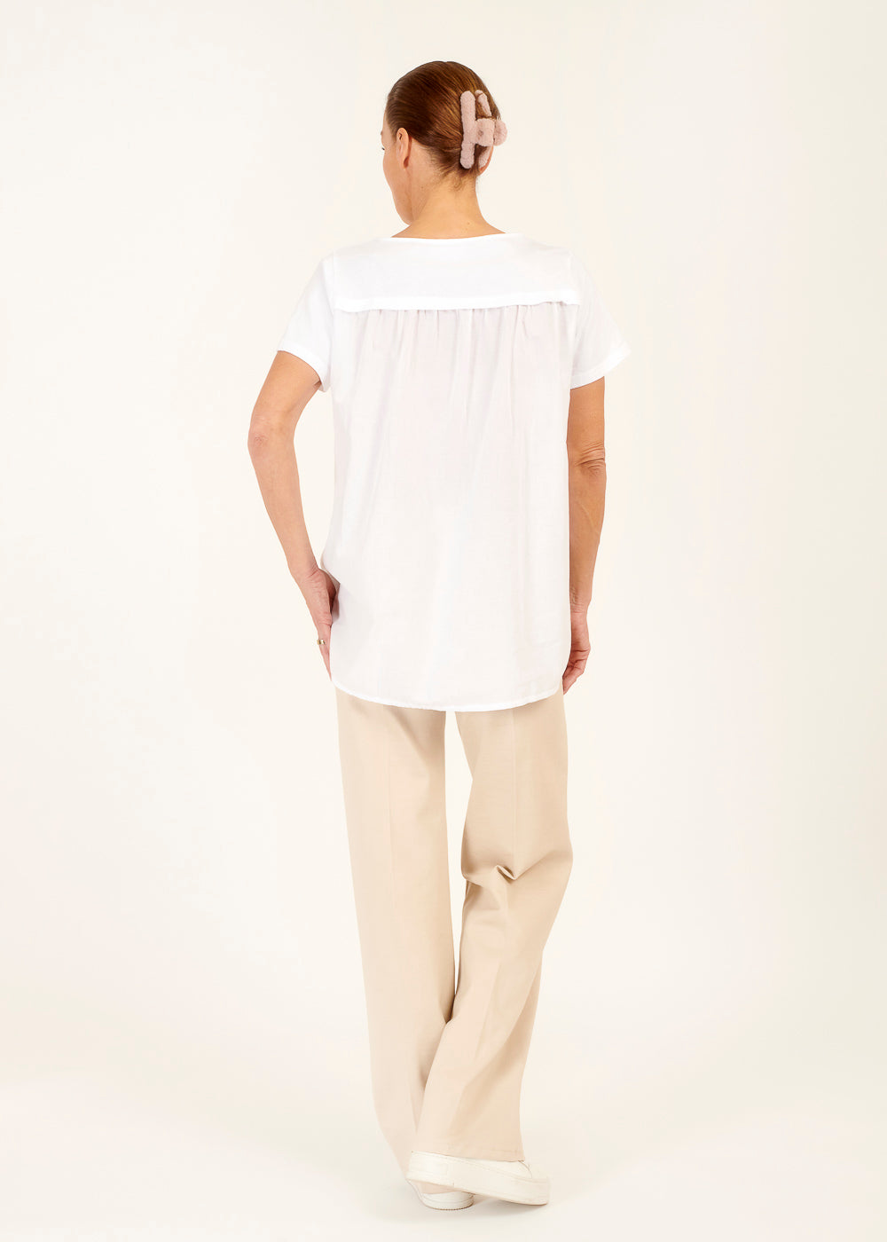 Ein Shirt, das deinen Look auf ein neues Level hebt: Unser Materialmix-Shirt in strahlendem Weiß mit rundem Halsausschnitt und raffinierten Details auf der Rückseite.