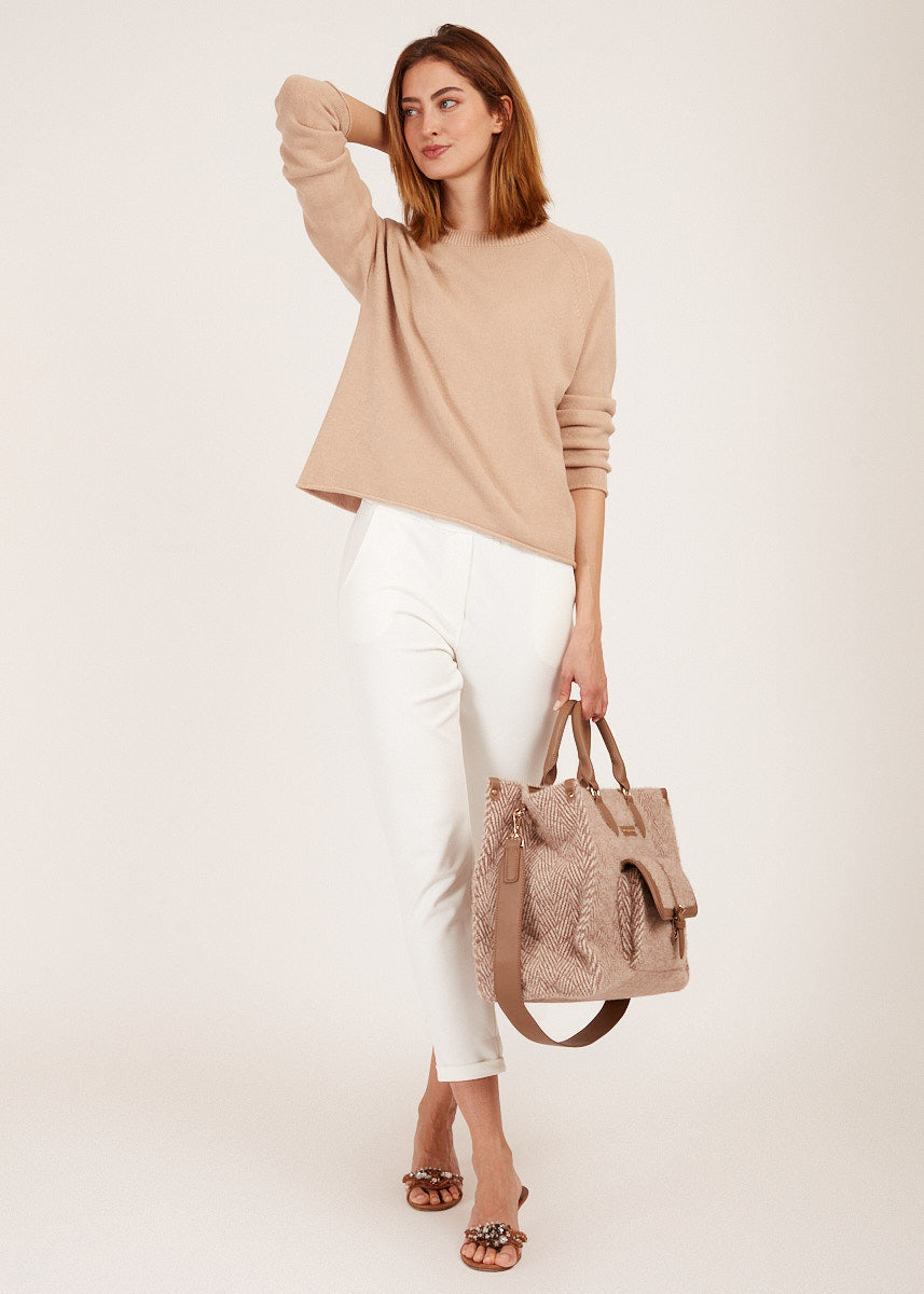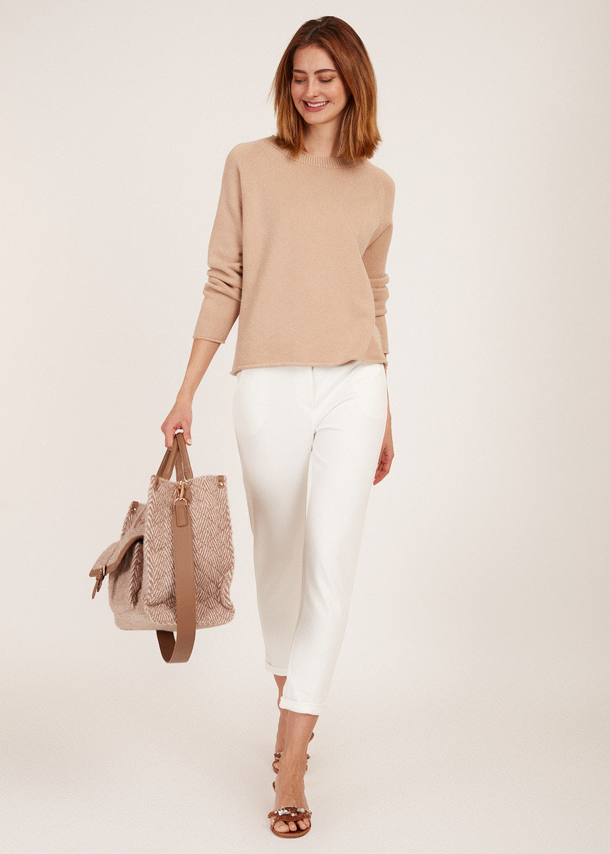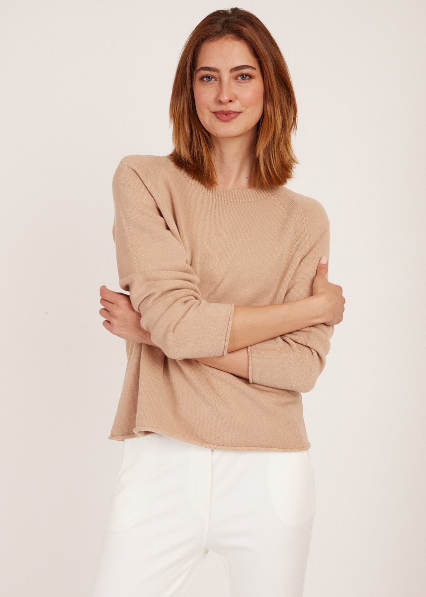 Entdecke unseren Pullover mit Rollkante in Sand - ein zeitloses Kleidungsstück, das Eleganz und Komfort vereint und dir einen Hauch von Luxus für deine Garderobe bietet.