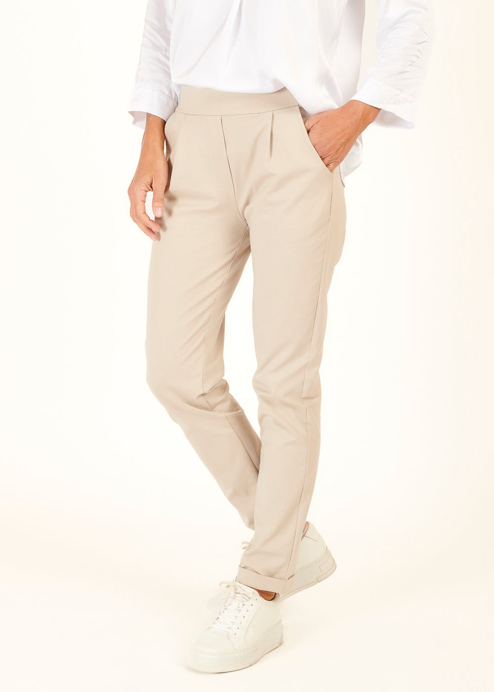 Mit unserer beigefarbenen Hose mit Gummizug triffst du die perfekte Wahl für einen Look, der sowohl stilvoll als auch bequem ist. Gönn dir das Vergnügen und die Raffinesse dieses zeitlosen Klassikers und genieße den ganzen Tag über ultimativen Komfort und zeitlose Eleganz.