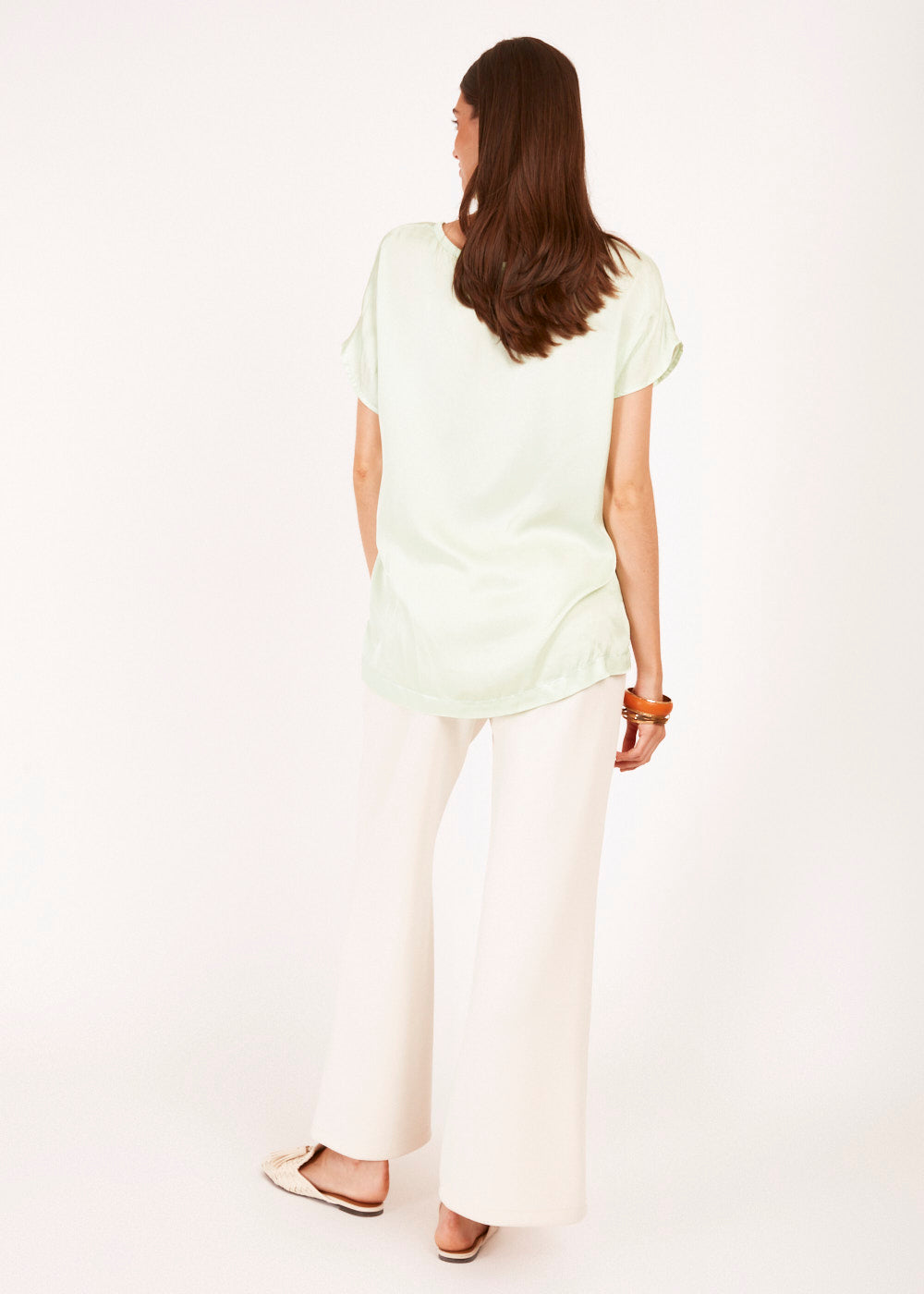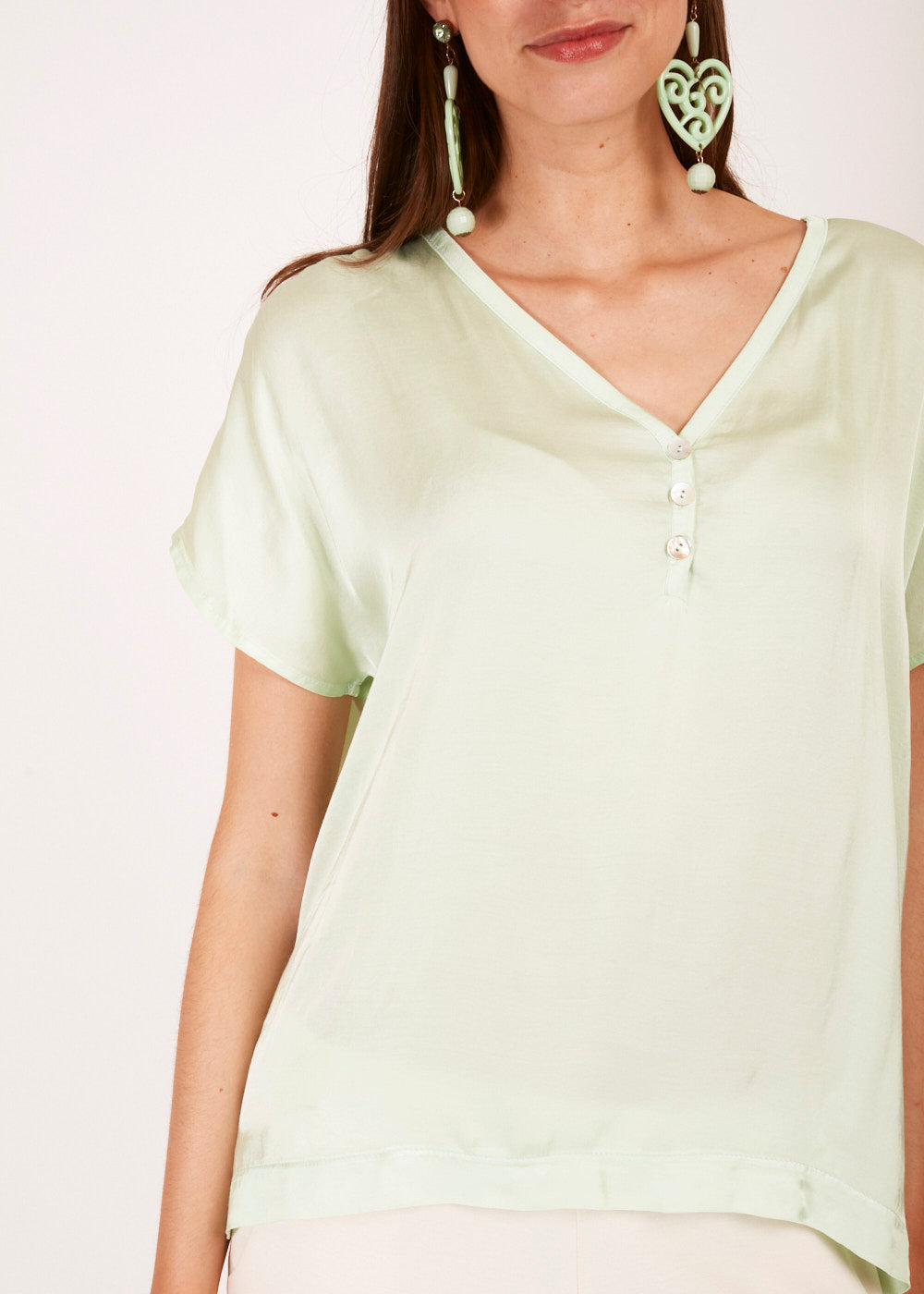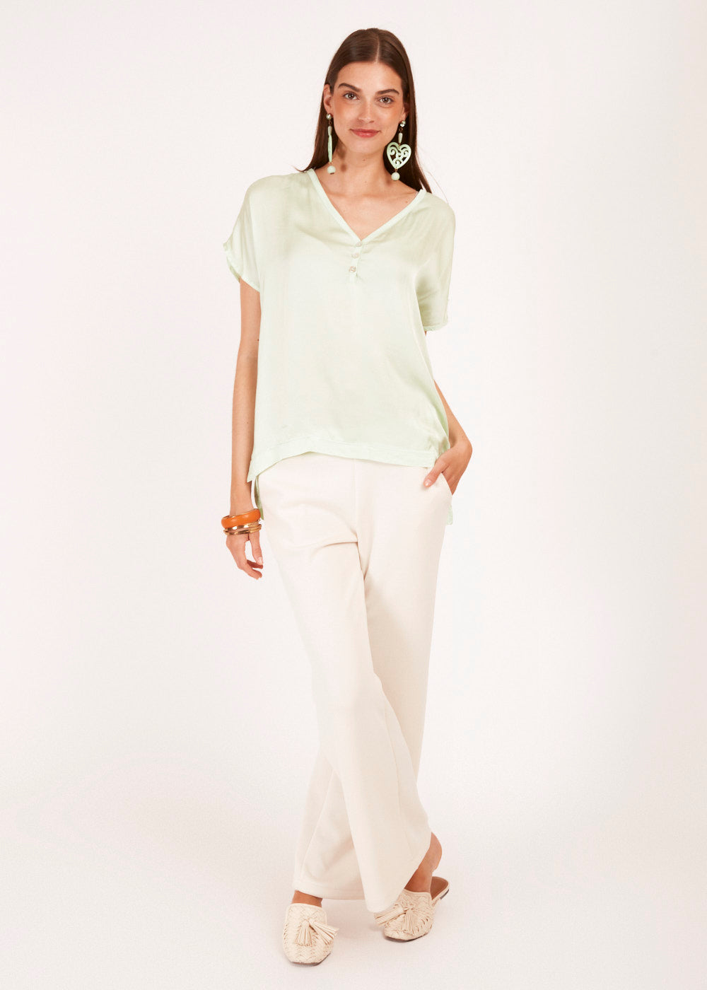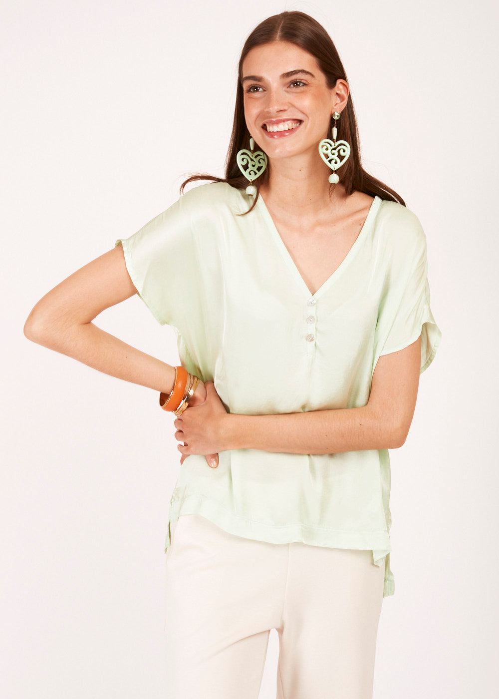 Unsere Tunikabluse in zartem Mintgrün kombiniert stilvolle Eleganz mit hohem Tragekomfort dank ihrer lockeren Passform und feinen Details wie perlmuttfarbenen Knöpfen – perfekt für jeden Anlass, ob im Büro, beim Brunch oder abendlichen Spaziergang.
