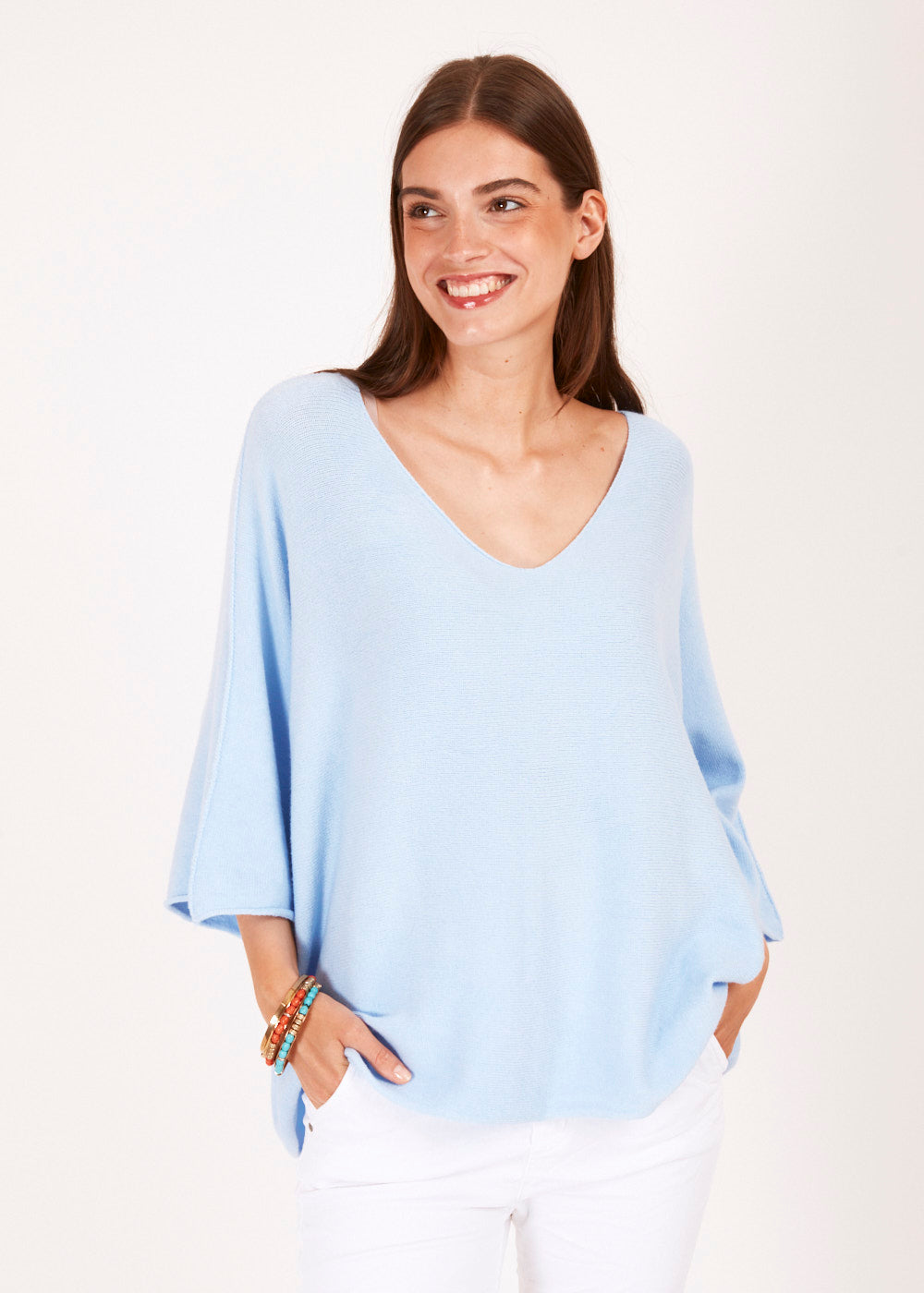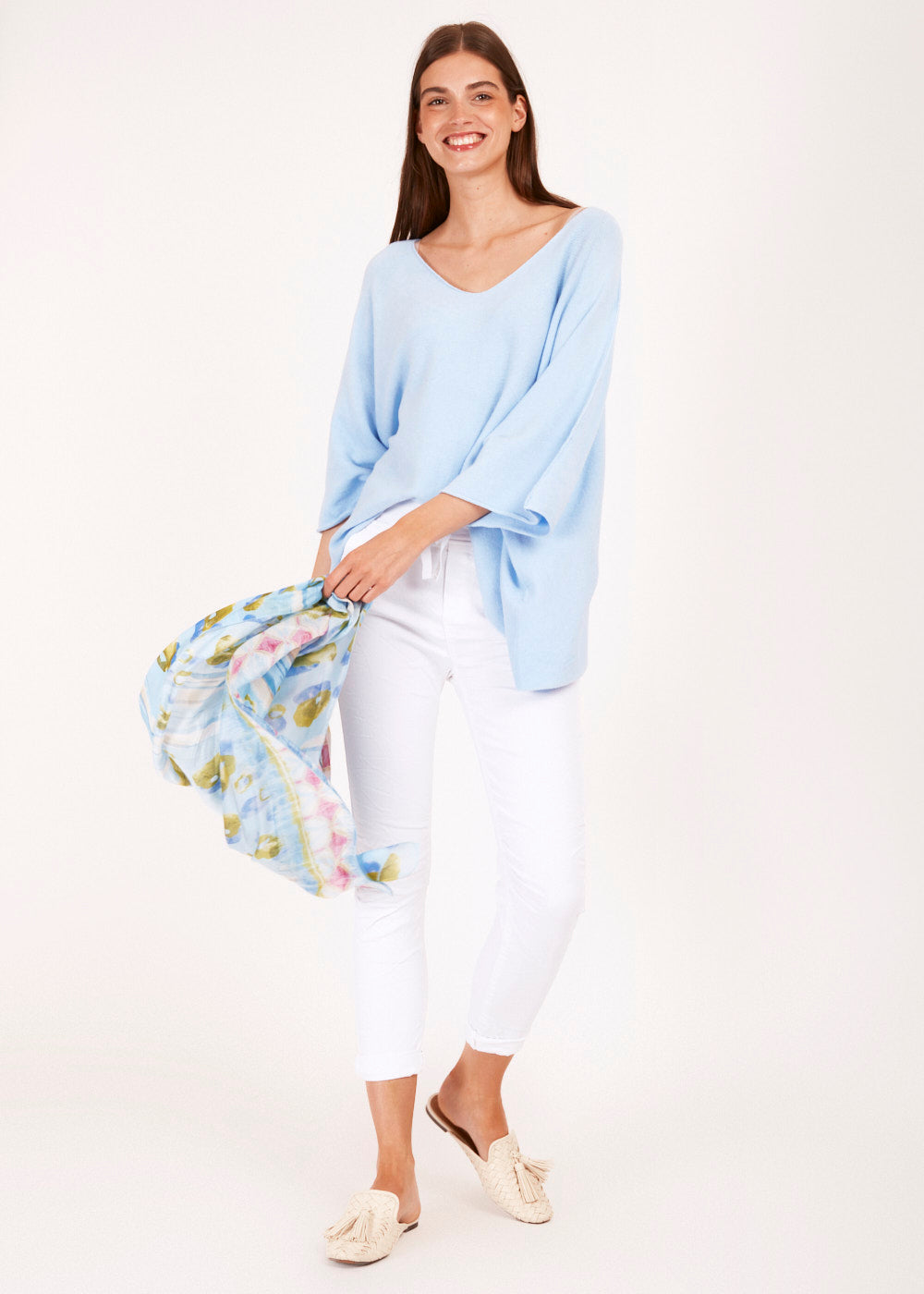 Der Kimonopullover in der Traumfarbe Cielo lässt sich ideal zu einer schicken, weißen Hose kombinieren.