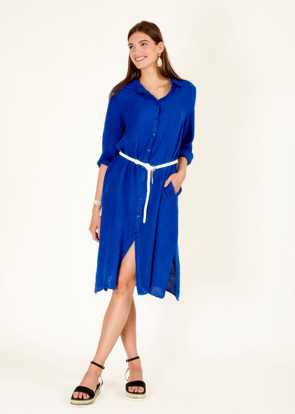 Erlebe den eleganten Komfort des Leinenhemdblusenkleids in royal. Perfekt für warme Tage, verleiht es deinem Look eine mühelose Raffinesse.