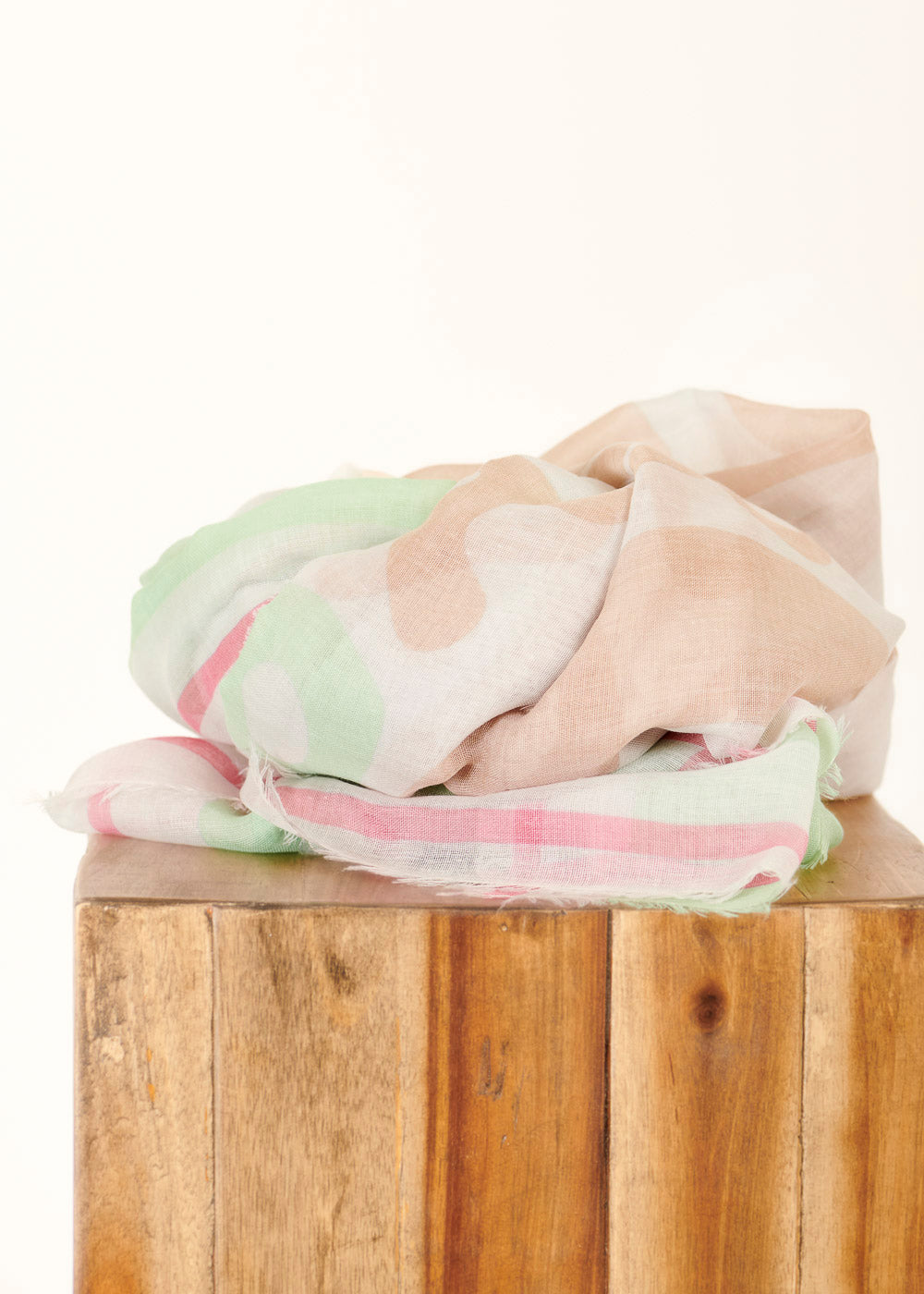 In einem harmonischen Zusammenspiel aus Pink, Grün und Beige verkörpert dieser Schal die Lebendigkeit des Moments. Jeder Farbton erzählt eine Geschichte, vermittelt eine Emotion und fängt die Essenz des Lebens ein.