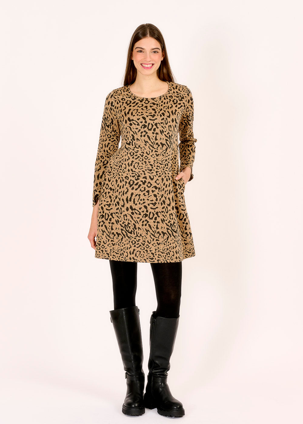 Entdecke das elegante Animalkleid in der warmen Farbe Cappuccino – perfekt für einen stilvollen Auftritt mit einem Hauch von Wildheit. Fühl dich rundum wohl in diesem aufregenden Design, das Komfort und Trend vereint!