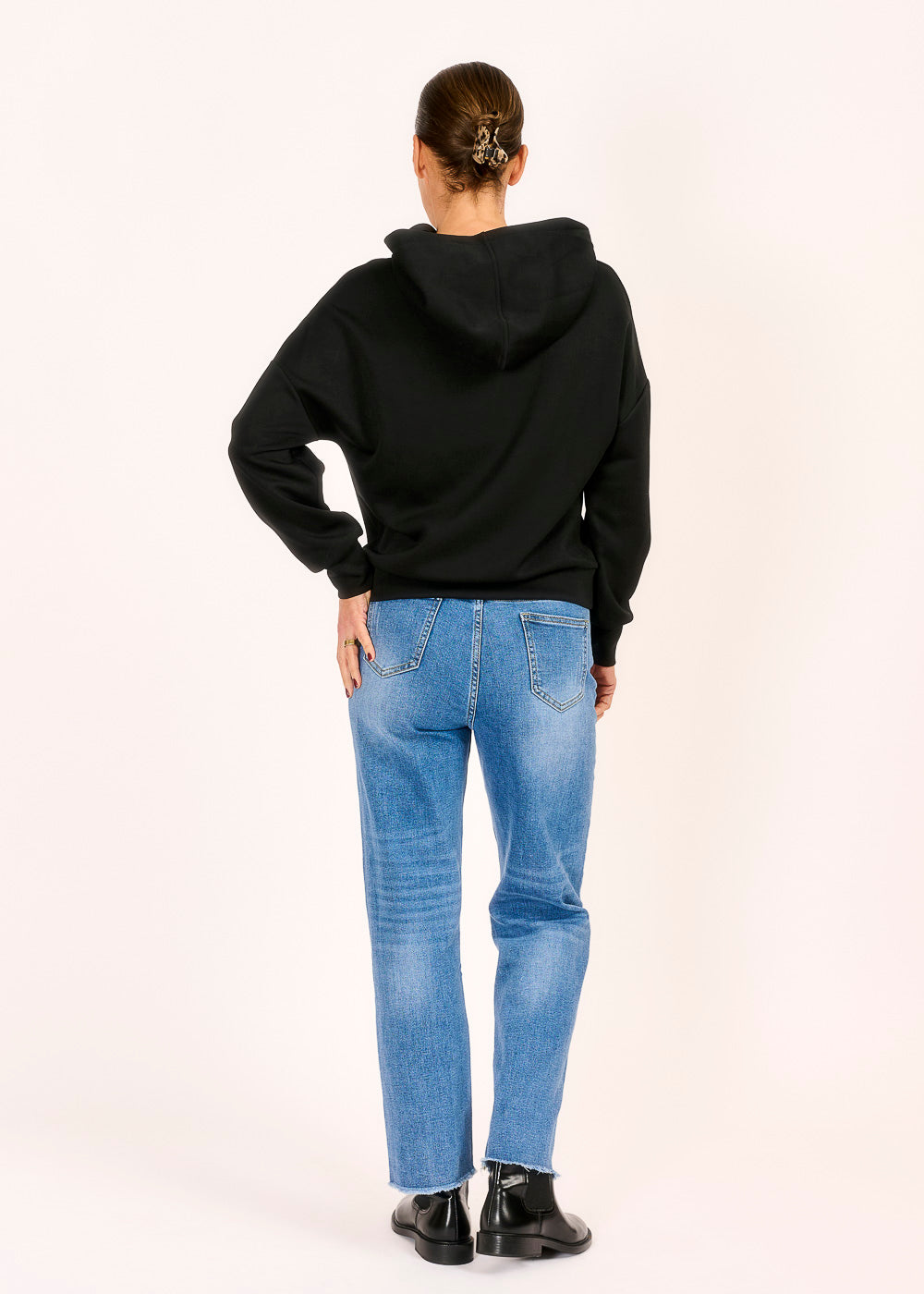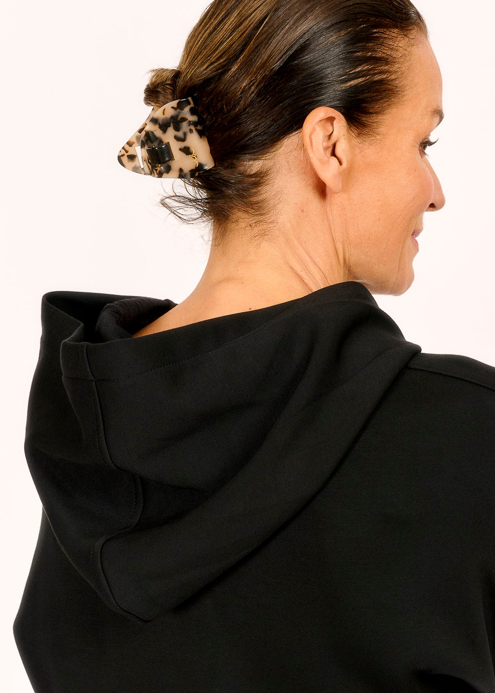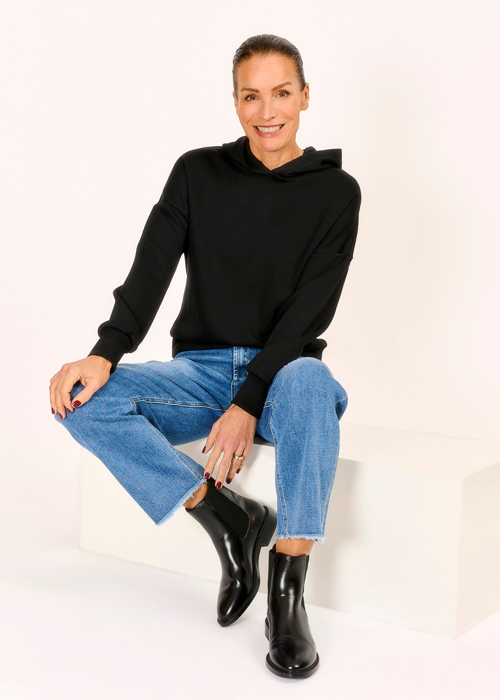 Der schwarze Lieblingshoody, den Du nie wieder ausziehen willst: superweich, stylisch und perfekt für jeden Tag. Ob gemütlich zu Hause oder unterwegs – Dein neuer Alltagsheld wartet auf Dich! Casual gestyled mit einer blauen Jeans oder edler mit unserer Animalprinthose.