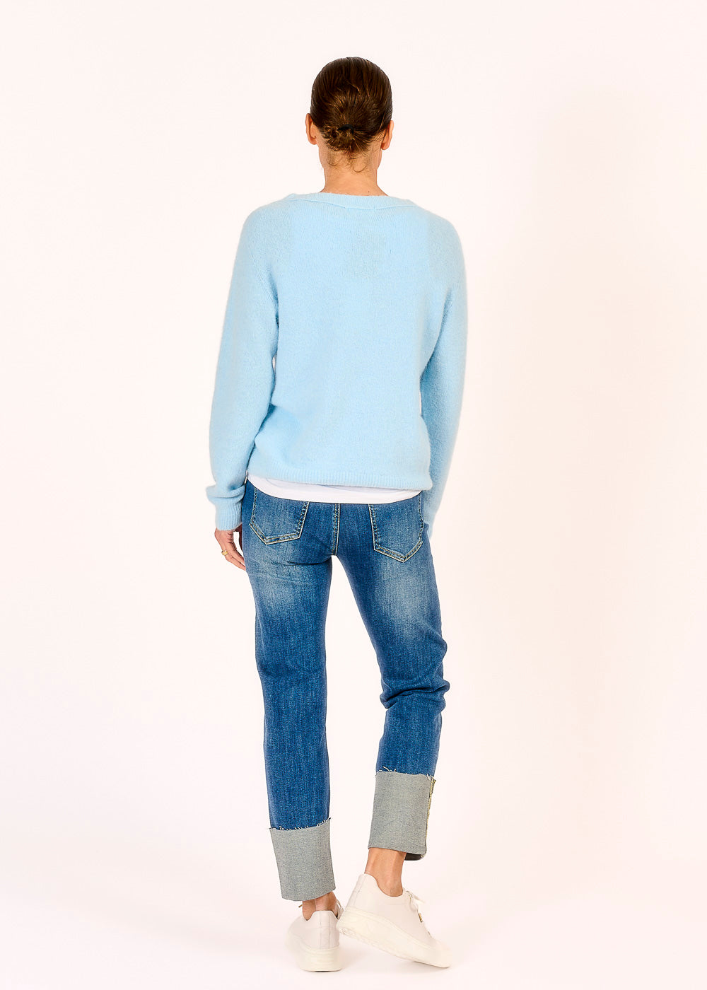 Unser Pullover in zartem Celeste-Ton verleiht deinem Outfit eine frische, moderne Note. Der schmeichelhafte V-Ausschnitt sorgt für eine elegante Silhouette und macht ihn sowohl für den Alltag als auch für besondere Anlässe perfekt. Aus weichem, hochwertigem Material gefertigt, bietet dieser Pullover ein angenehmes Tragegefühl und ist vielseitig kombinierbar.