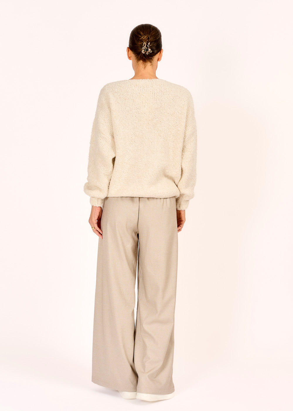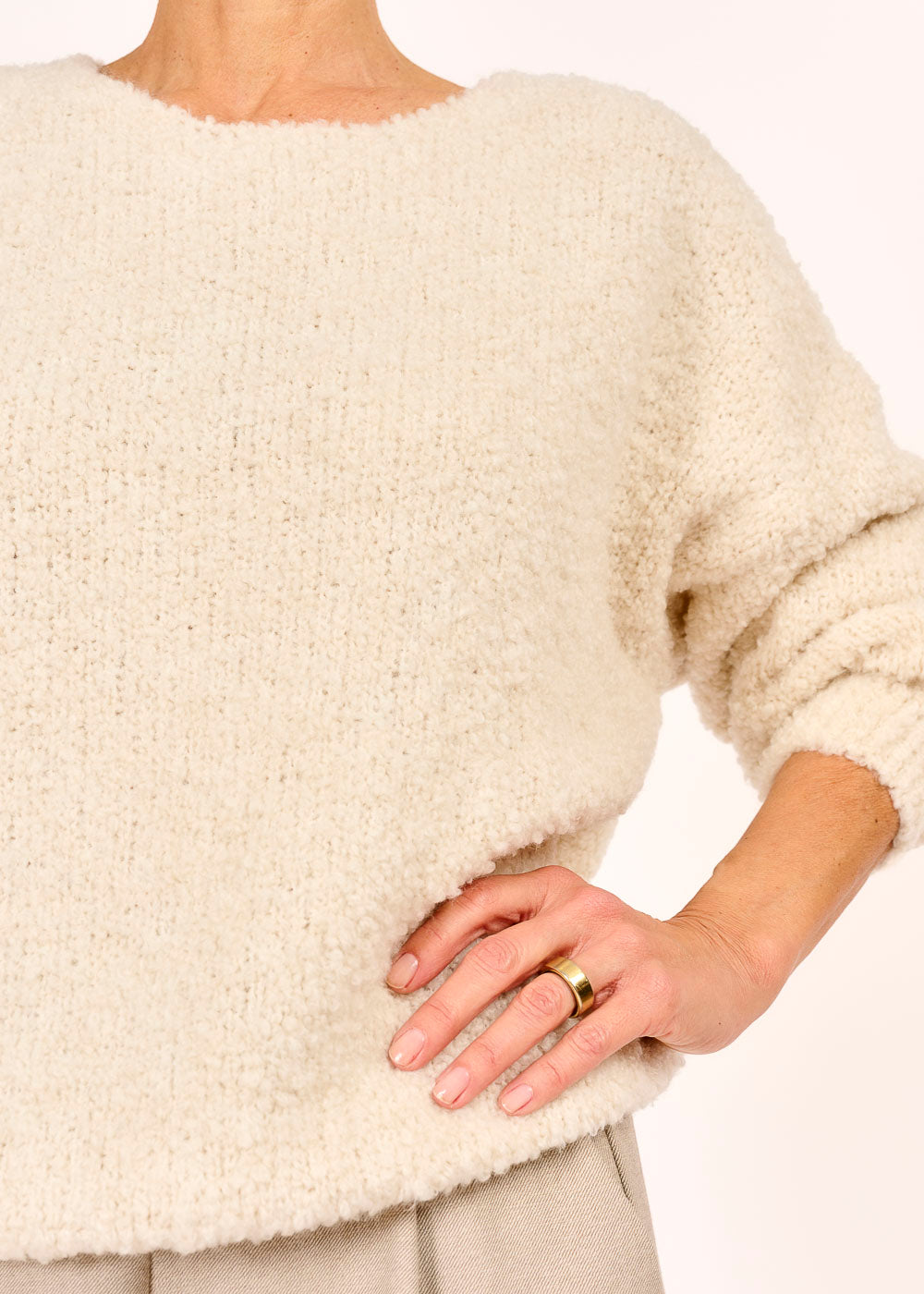 Kuschelig, stilvoll und vielseitig – dieser Bouclepullover in Beige ist dein perfekter Begleiter für gemütliche Tage und elegante Outfits. Weich und zeitlos im Design, ergänzt er deinen Look mit einer warmen, modernen Note.