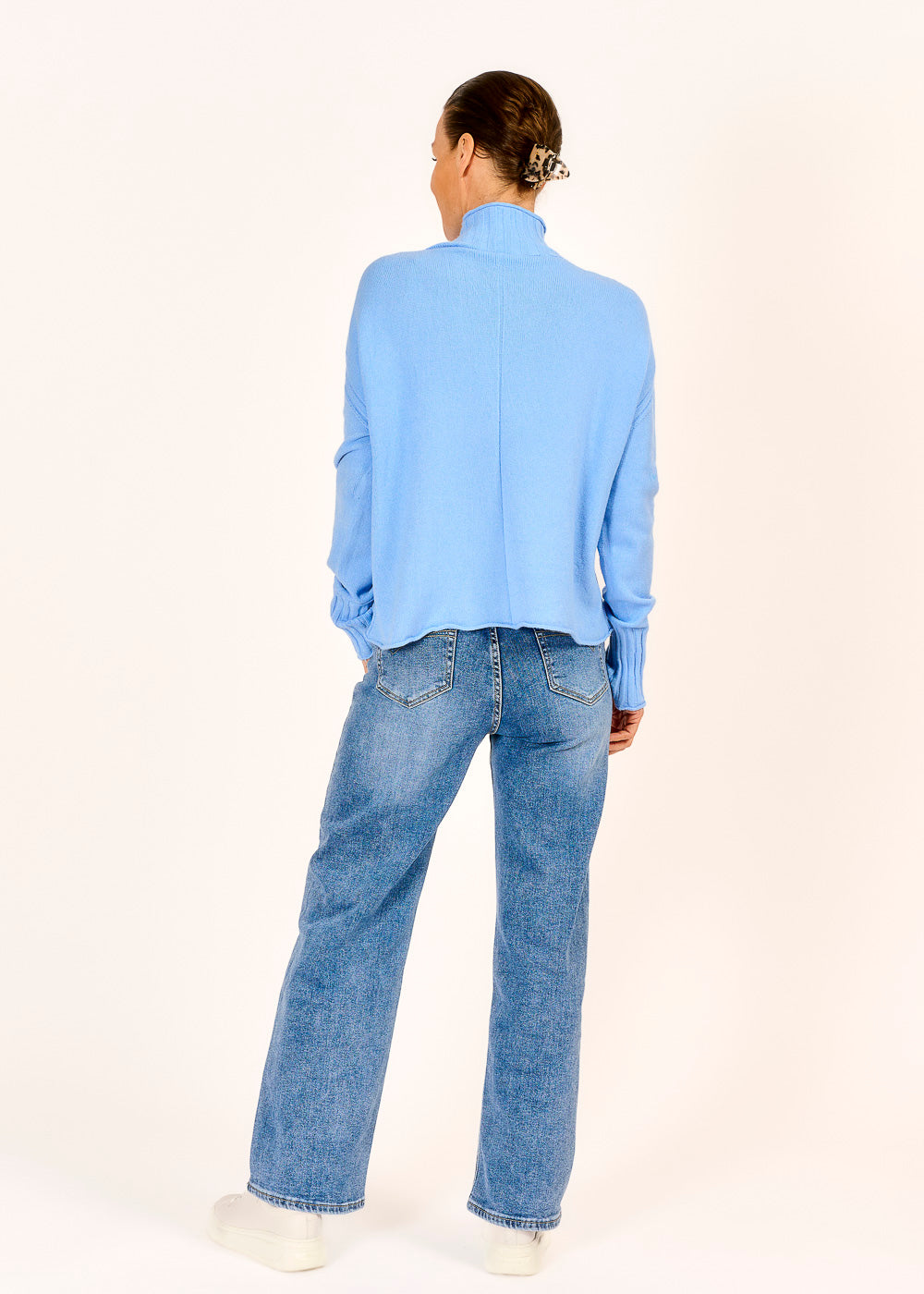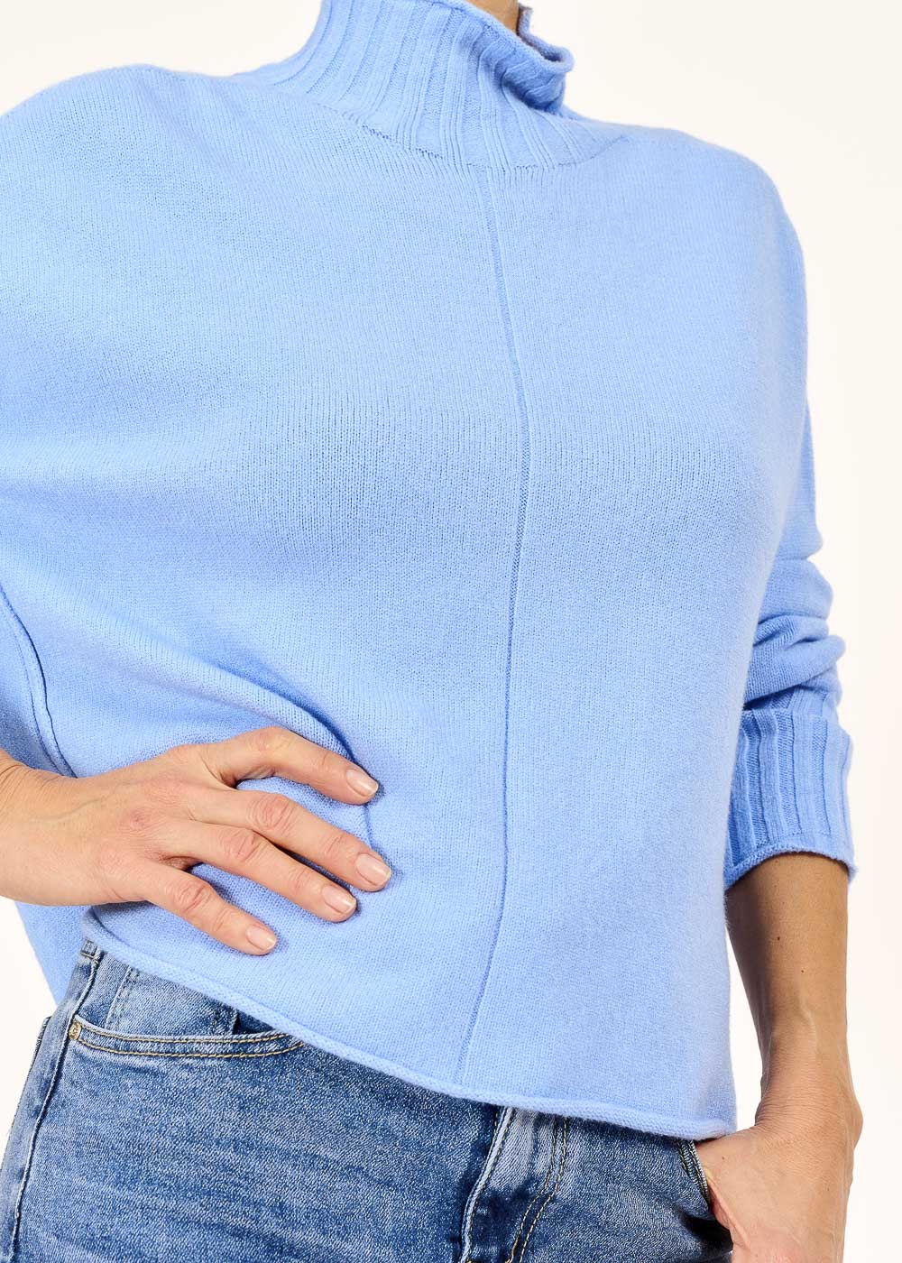 Verleihe deinem Look zeitlose Eleganz mit unserem Stehkragenpullover in der sanften Farbe Cielo. Kuschelig weich und stilvoll zugleich – dein neues Lieblingsstück für jede Gelegenheit!