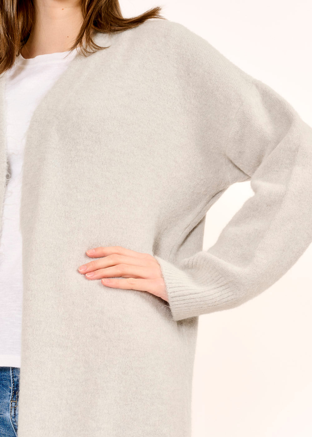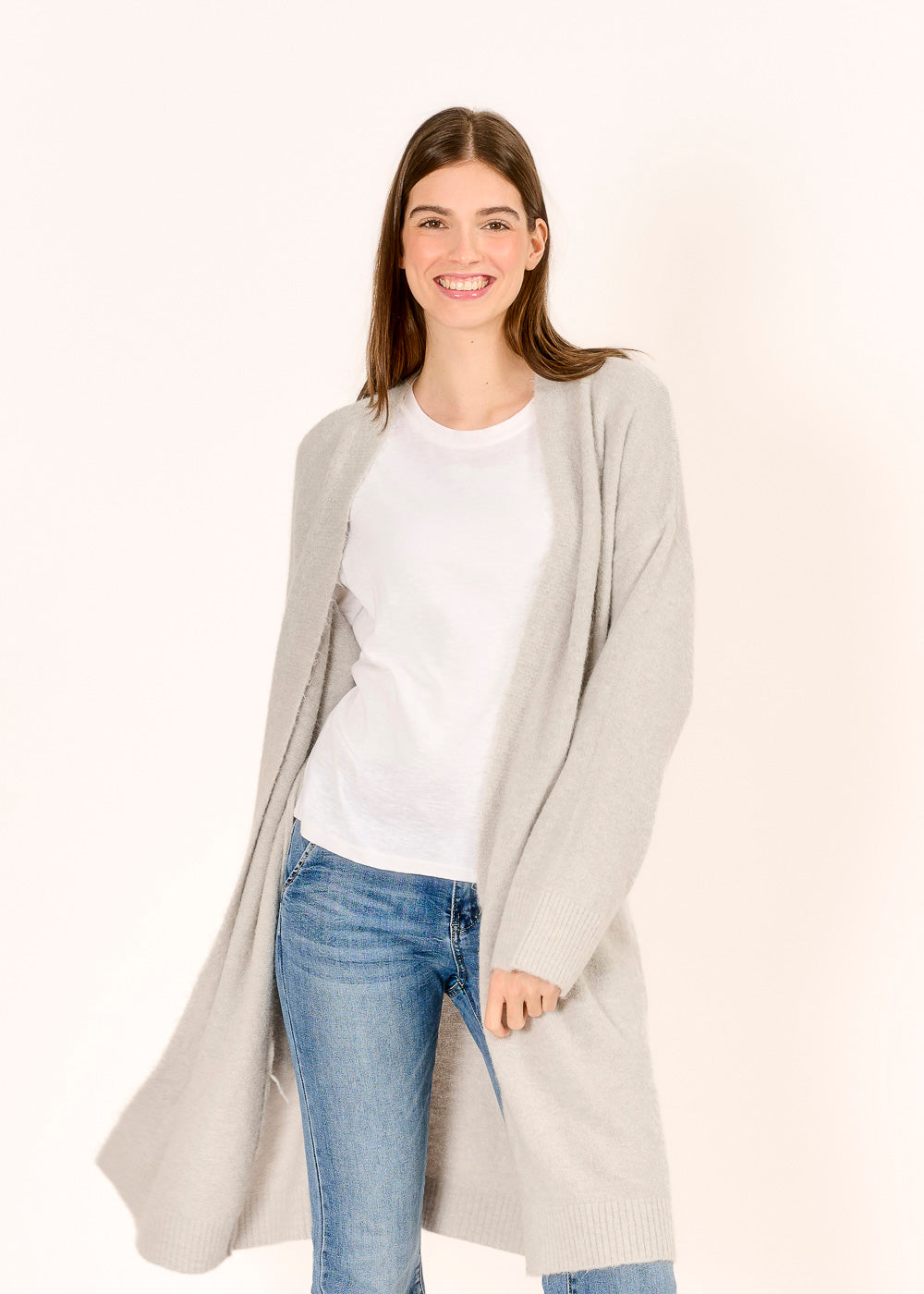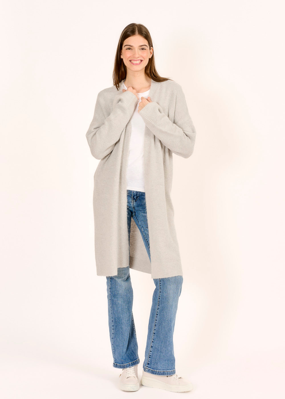Dieser edle Longcardigan in der Farbe Grigio begeistert mit seiner kuschelig weichen Qualität dank des Anteils an hochwertigem Babyalpaka. Die praktische Länge – weder zu lang noch zu kurz – macht ihn zum vielseitigen Begleiter für elegante und gemütliche Looks.