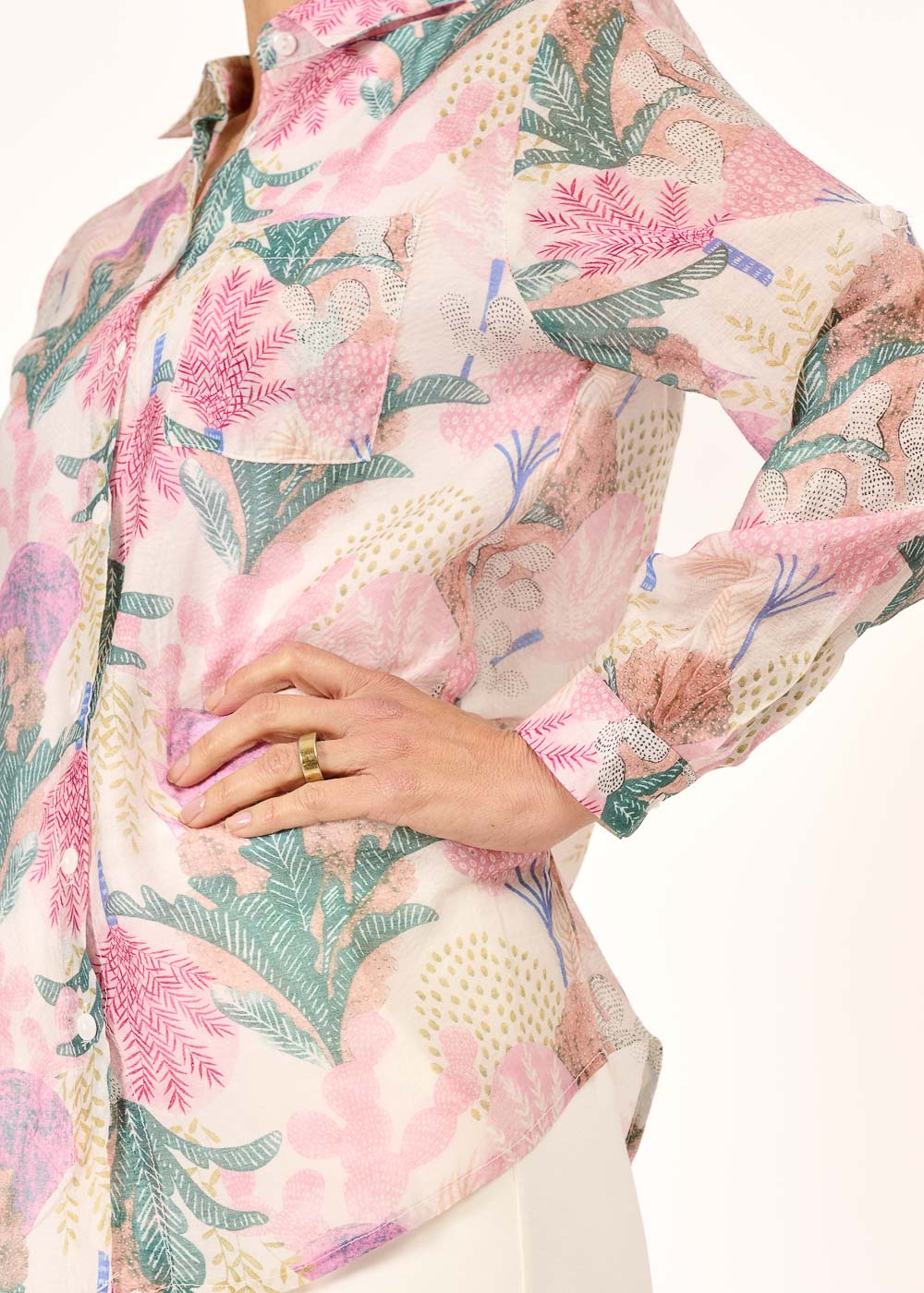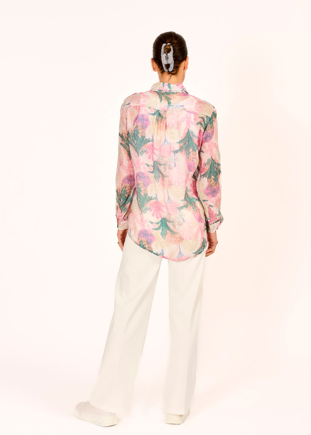 Diese Hemdbluse begeistert mit einem zarten Muster in sanften Rosatönen und verleiht jedem Look eine feminine Leichtigkeit. Der schmale Kragen unterstreicht das elegante Design, während das leichte Material für ein angenehmes Tragegefühl sorgt. Ob im Büro oder in der Freizeit – diese Bluse ist ein stilvoller Allrounder.