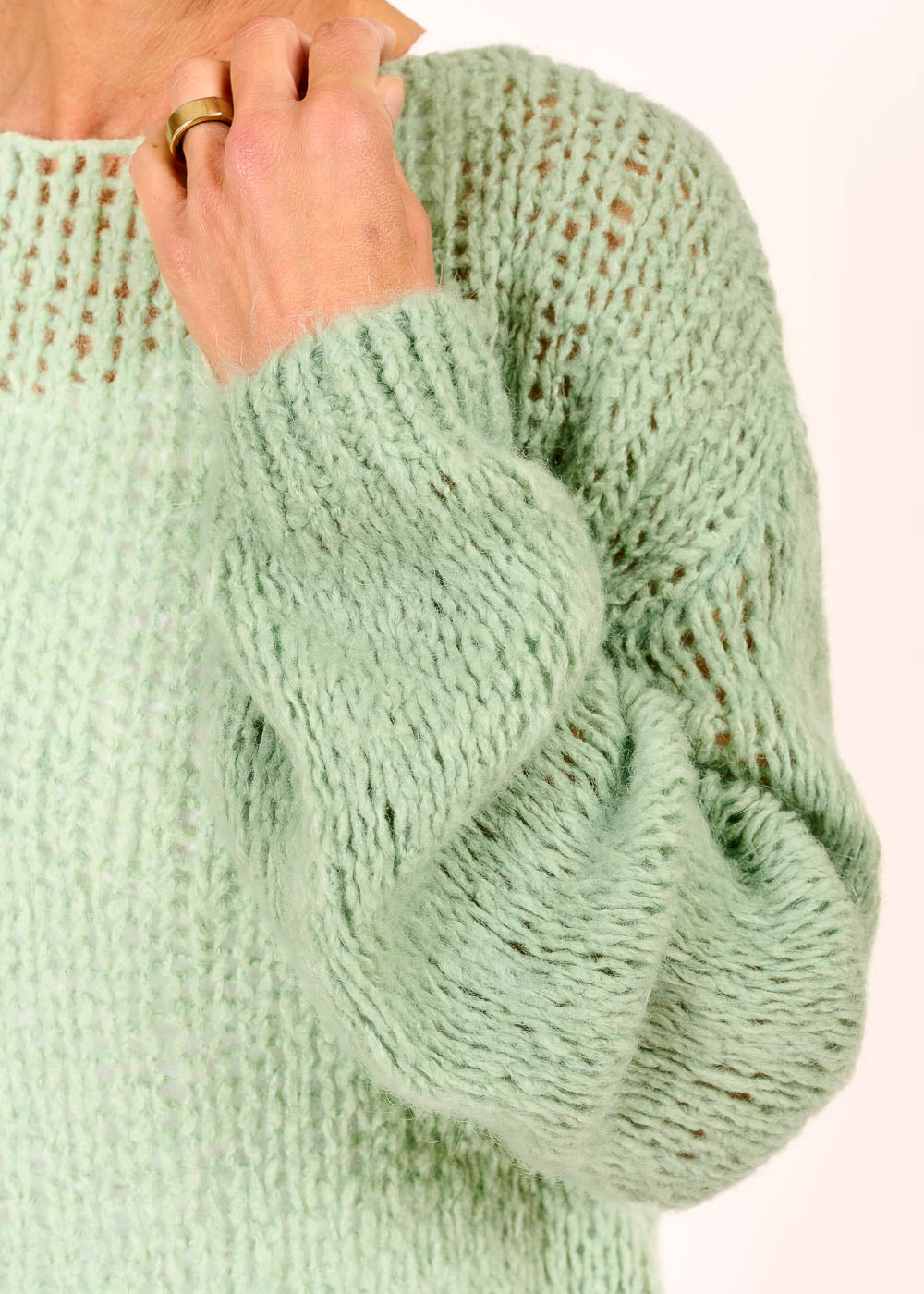 Dieser Grobstrickpullover in der frischen Farbe Menta bringt einen Hauch von Frühlingsfrische in deine Looks. Die lockere Strickstruktur sorgt für eine lässige Optik und ein angenehmes Tragegefühl. Perfekt für kühle Tage – stylisch, cozy und wunderbar vielseitig kombinierbar.