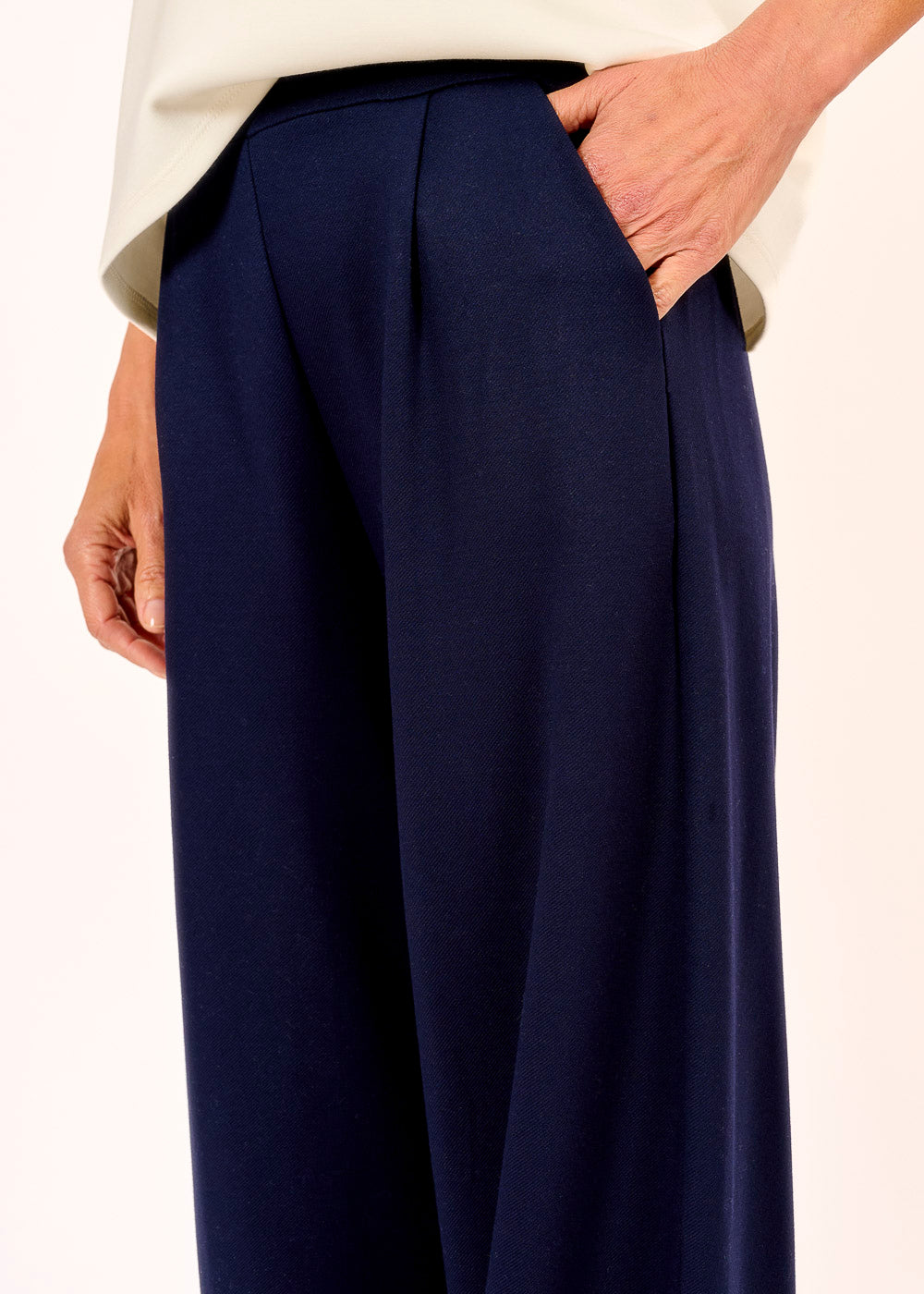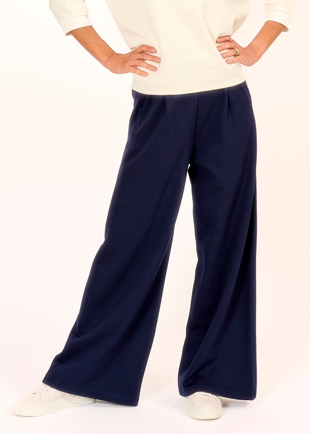 Diese Marlenehose in edlem Blu Scuro begeistert mit ihrem weiten Bein und einem fließenden Fall. Der elegante Schnitt zaubert eine schmeichelhafte Silhouette und sorgt für einen stilvollen Auftritt. Ob im Büro oder in der Freizeit – diese Hose verbindet Komfort mit zeitloser Eleganz.