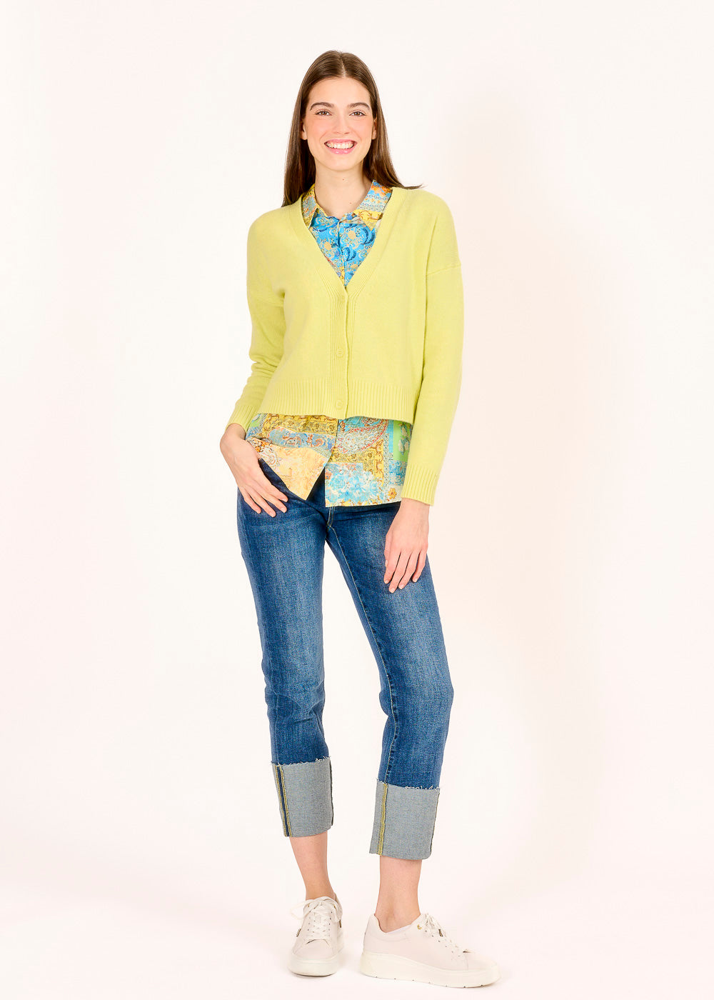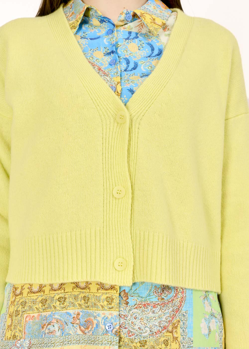 Diese kurze Strickjacke im fröhlichen Zitrone-Ton bringt sofort gute Laune in deine Garderobe. Der frische Farbton sorgt für einen lebendigen Akzent und macht sie zum idealen Begleiter an warmen Tagen oder kühlen Abenden. Leicht zu kombinieren und herrlich bequem – ein echtes Lieblingsstück für den Frühling!
