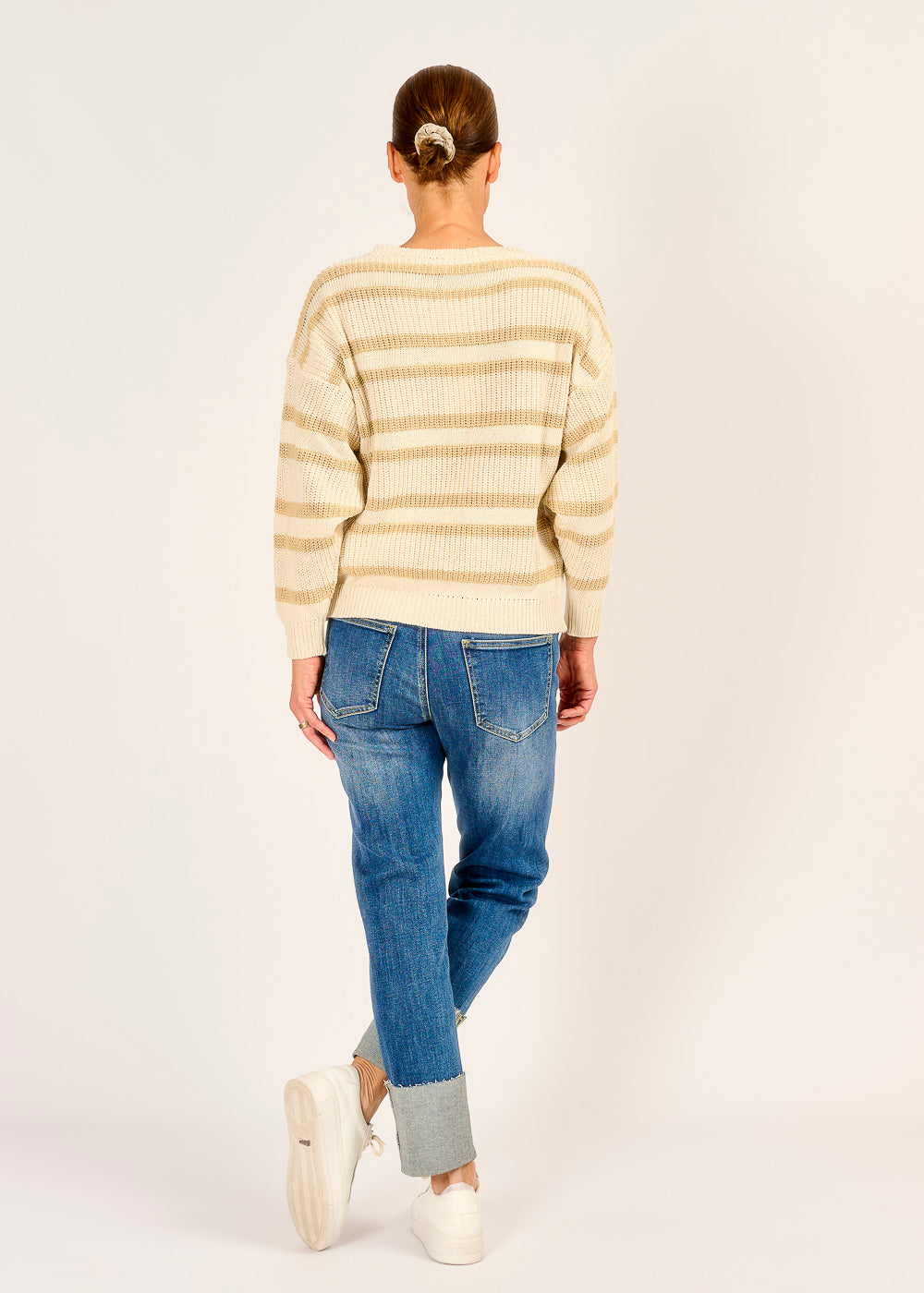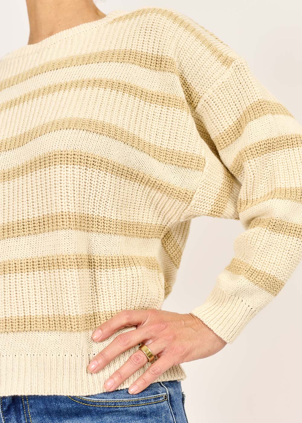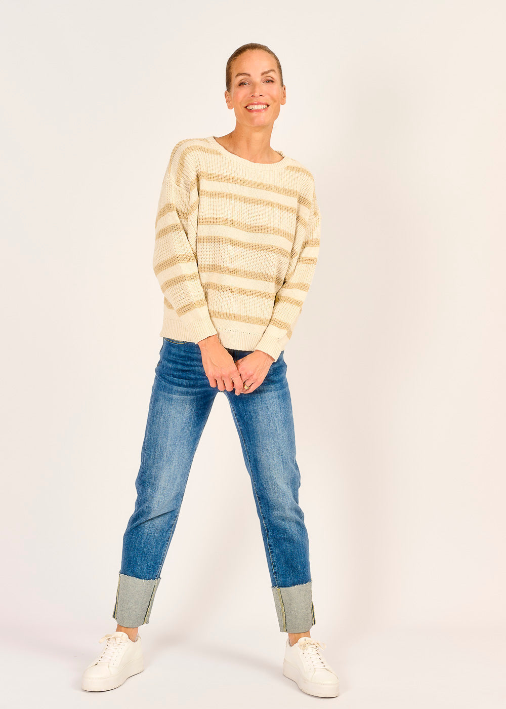 Dieser Streifenpullover in edlem Beige überzeugt mit einem spannenden Strick-Mix – grober und feiner Strick wechseln sich stilvoll ab und sorgen für eine moderne Optik. Die leichte Struktur verleiht dem Pullover eine besondere Tiefe und macht ihn zu einem echten Hingucker. Lässig geschnitten und angenehm zu tragen, ist er der perfekte Begleiter für entspannte, stilvolle Alltagslooks.